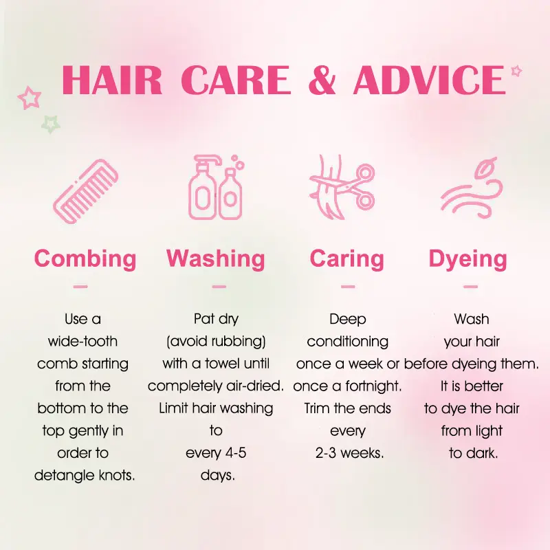 Warm Tips: 1. Color Variation: Color may vary due to light and brightness, not a quality issue. 2. Care: Use essential oils for deep care and trim hair tips monthly. 3. Skin Sensitivity: Perform a skin test 24 hours before use if you have a pre-existing scalp condition or skin sensitivity. Stop use if irritation, redness, or discomfort occurs. Seek medical help if necessary.