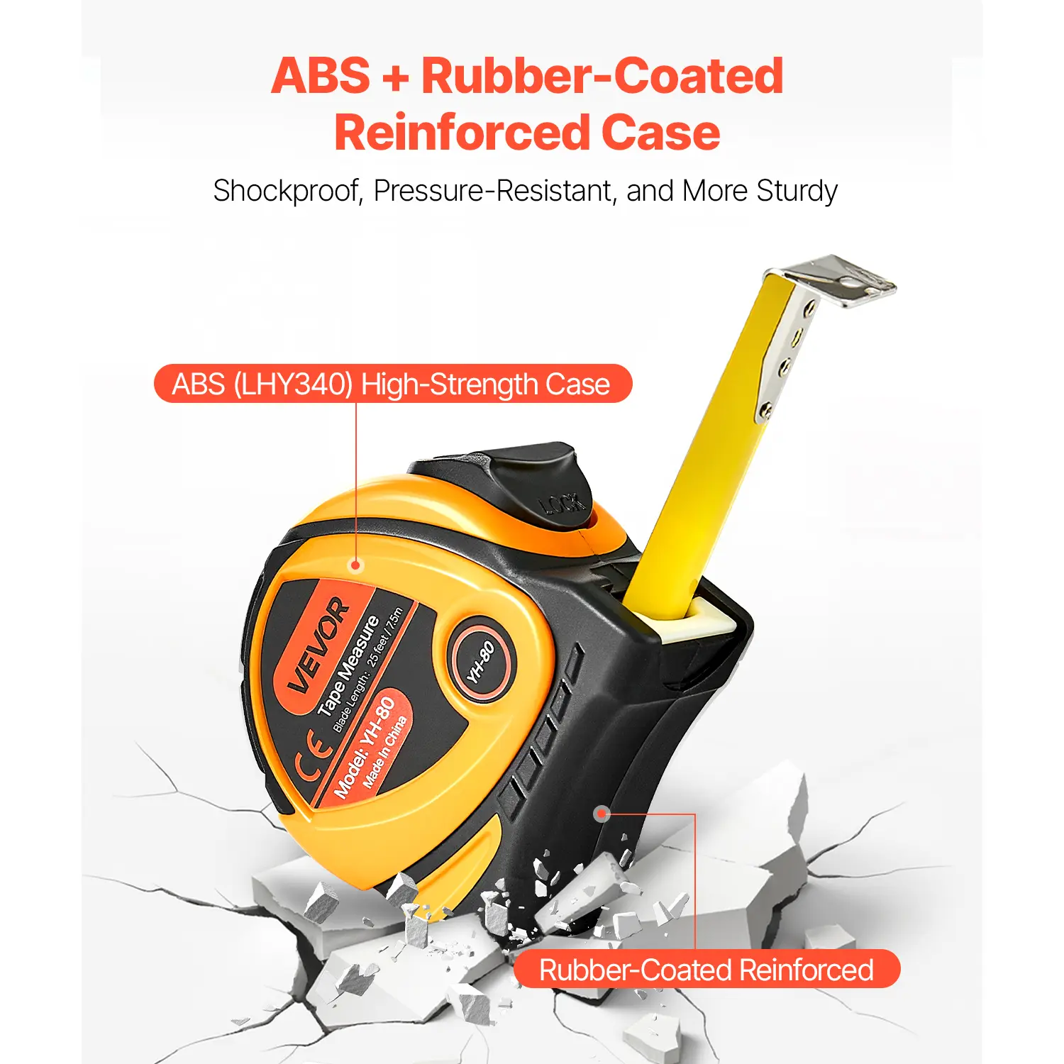 âą ABS High-Strength Shell: The tape measure features an ABS (LHY-340) high-strength impact-resistant plastic shell with reinforced rubber coating. It disperses external impact forces, resists drops, friction, and corrosion, offering sturdy protection in tough worksite conditions