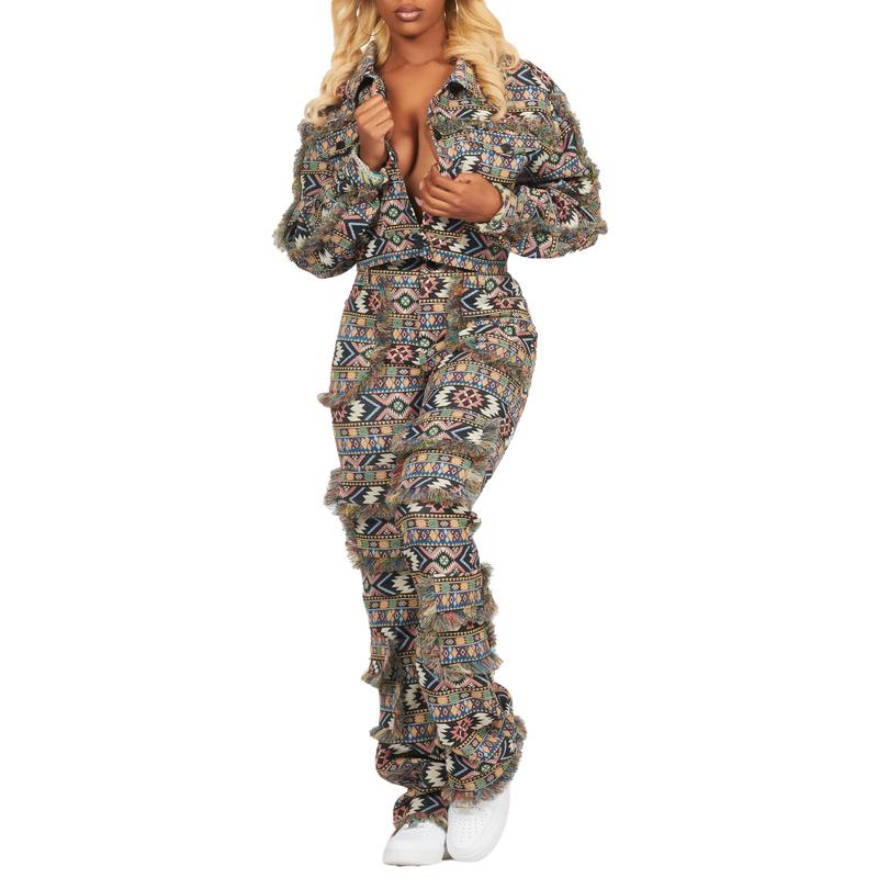 An urban tapestry denim jacket for women in black. Designed with contrast botanical fabric and custom embroidery for the perfect layering piece.