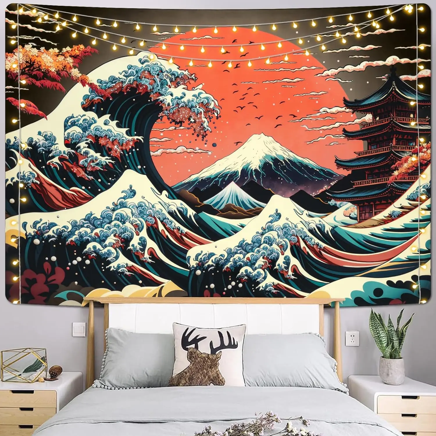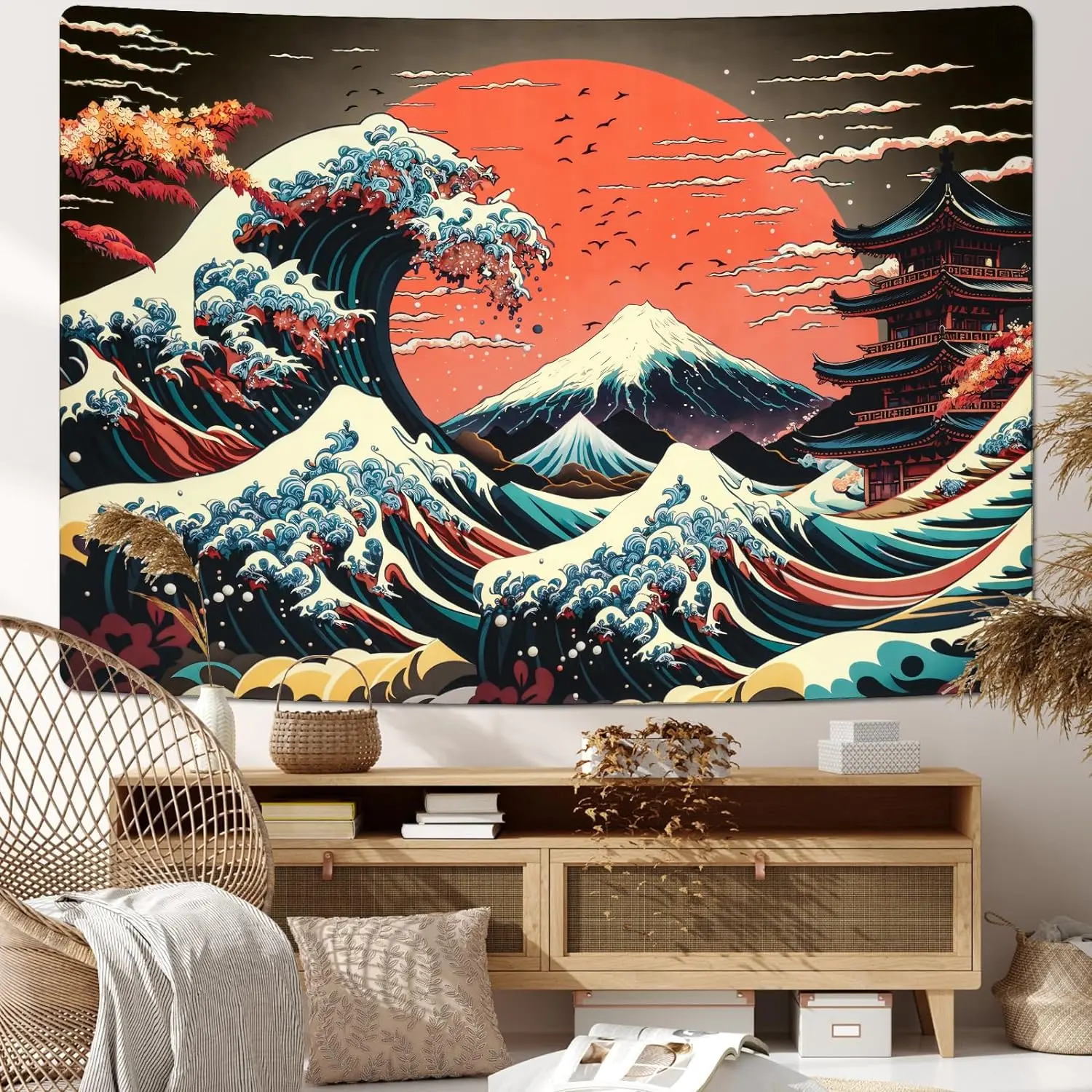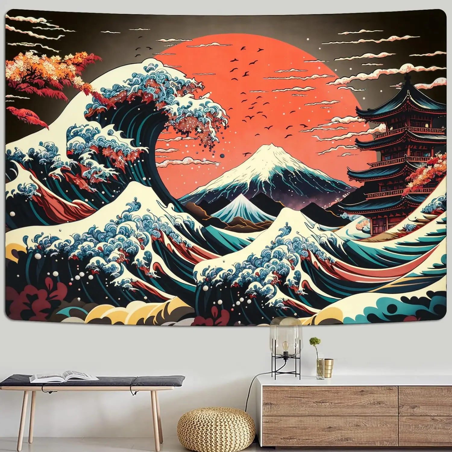 The Great Wave Tapestry Japanese Ocean Sea Wave Lightweight Tapestries Vintage Asian Anime Wall Art Tapestry Aesthetic Kanagawa Tapestry Mountain Sunset Tapestry Wall Hanging for Home Room Bedroom Decor
