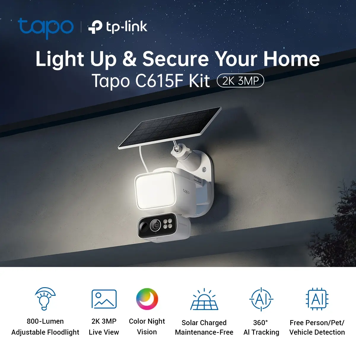 What's Included:Tapo C615F Camera × 1、Tapo A201 Solar Panel × 1、Tapo A201 Solar Panel Bracket × 1、Base Cover × 1、USB Charging Cable × 1、Solar Extension Cable × 1、Mounting Screws and Anchors、Mounting Template Stickers × 2、Quick Start Guide