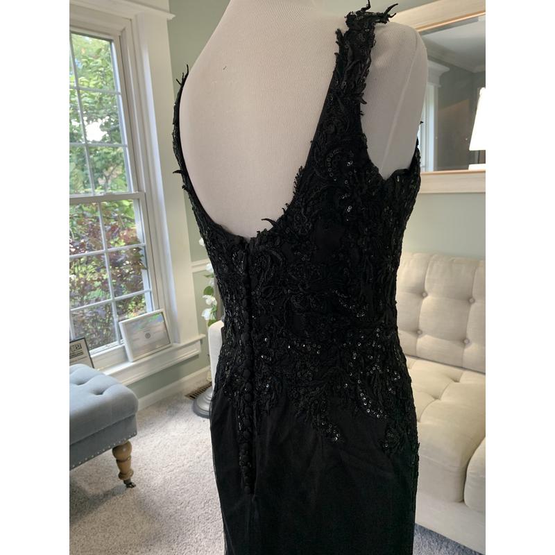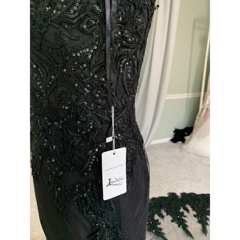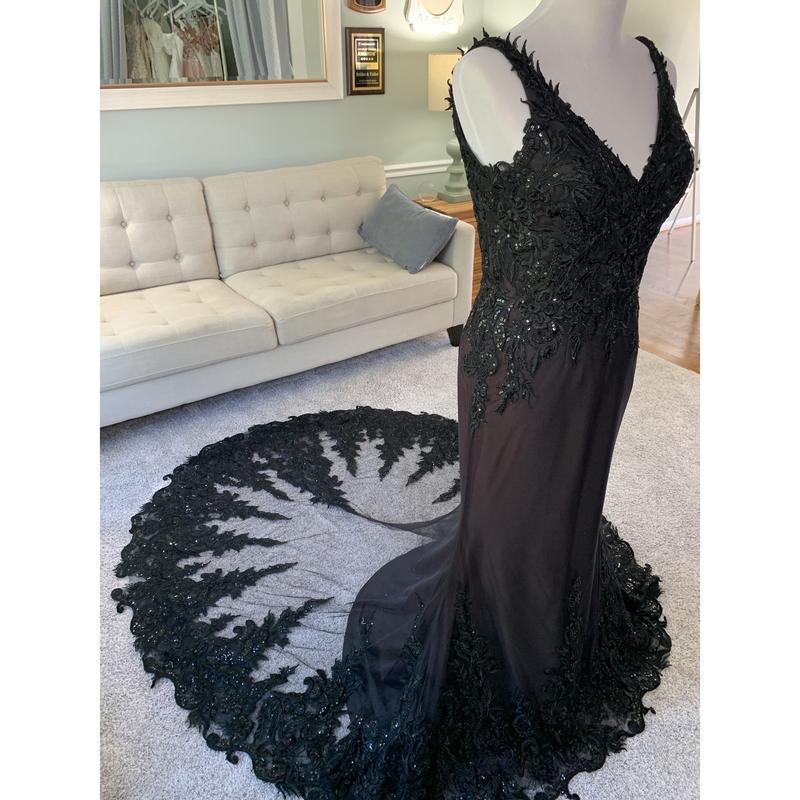 Our Tara E Custom Black Wedding Dress with V neckline includes a gorgeous V neckline, beautiful floral delicate black lace and plenty of shimmer. The lace also includes sequins for adding a subtle yet elegant sparkly effect to the dress. The back neckline includes a U shape and the skirt is gorgeous with an illusion-styled train.