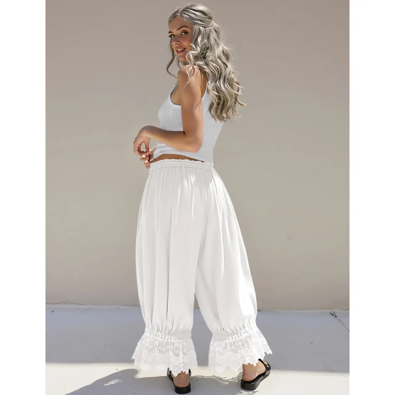 ·Features: Women Linen Lace Trim Long Bloomers loose fit, cute, elegant lace trim, functional tie-front straps, cropped legs with tapered hem, fairy lace pants, ruffle harem pants