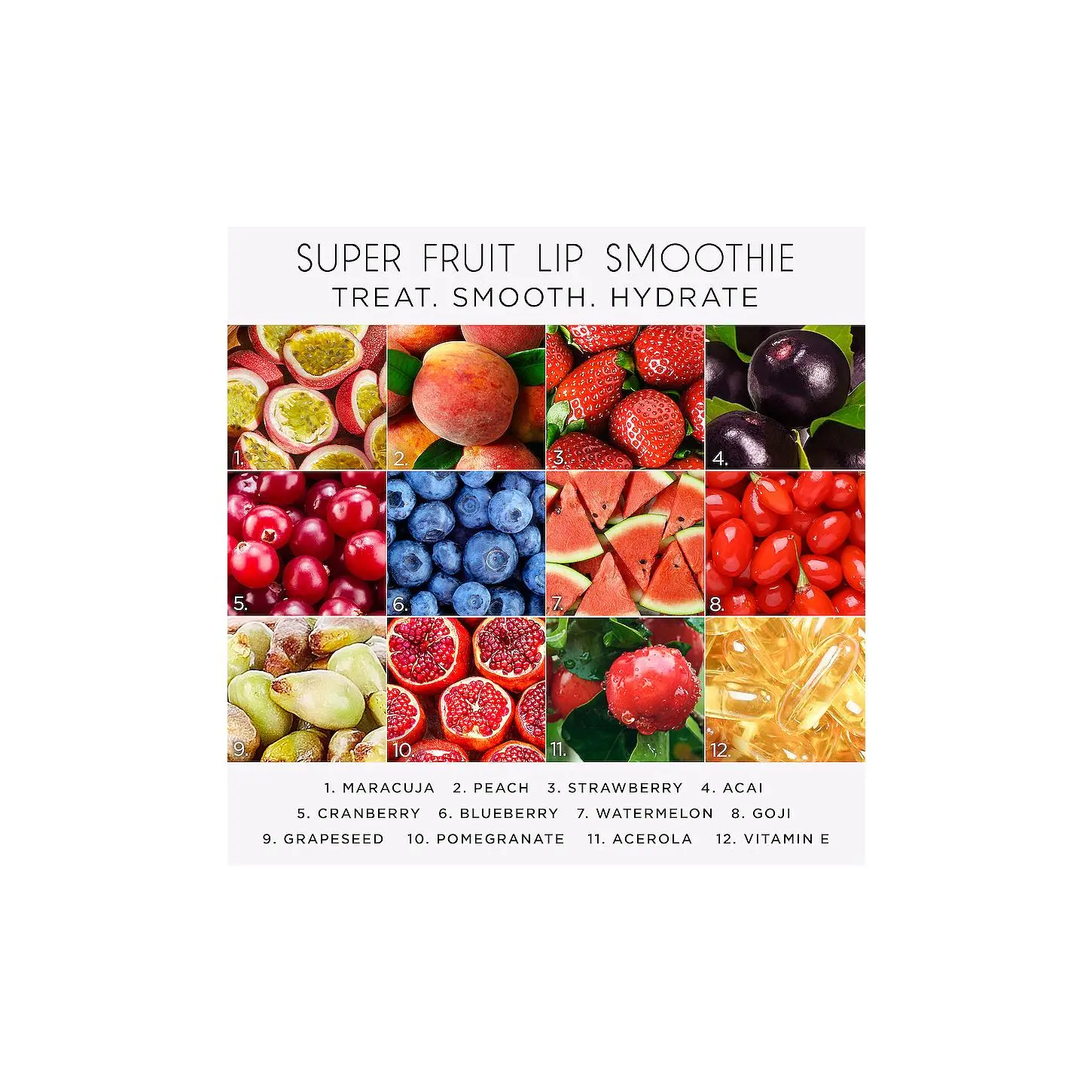 ·ingredients: Phytosteryl/Isostearyl/Cetyl/Stearyl/Behenyl Dimer Dilinoleate, bis-diglyceryl polyacyladipate-2, diisostearyl malate, hydrogenated polyisobutene, polyglyceryl-2 triisostearate, ceresin, menthone glycerin acetal, mica, calcium aluminum borosilicate, microcrystalline wax/cera microcristallina/cire microcristalline, synthetic fluorphlogopite, passiflora edulis seed oil, sodium hyaluronate, tocopherol, calcium titanium borosilicate, 1,2-hexanediol, ethylhexyl palmitate, flavor/aroma, benzyl benzoate, tocopheryl acetate, tin oxide, trihydroxystearin, vitis vinifera (grape) seed oil, benzyl alcohol, citrullus lanatus (watermelon) fruit extract, citrus limon (lemon) fruit extract, euterpe oleracea fruit extract, fragaria vesca (strawberry) fruit extract, lycium barbarum fruit extract, malpighia punicifolia (acerola) fruit extract, passiflora incarnata fruit extract, prunus persica (peach) fruit extract, punica granatum fruit extract, vaccinium angustifolium (blueberry) fruit extract, vaccinium macrocarpon (cranberry) fruit extract. (+/ -): Titanium Dioxide (CI 77891), iron oxides (CI 77491), red 28 lake (CI 45410). *Disclaimer: Ingredients are subject to change at the manufacturer's discretion. For the most complete and up-to-date list of ingredients, refer to the product packaging.