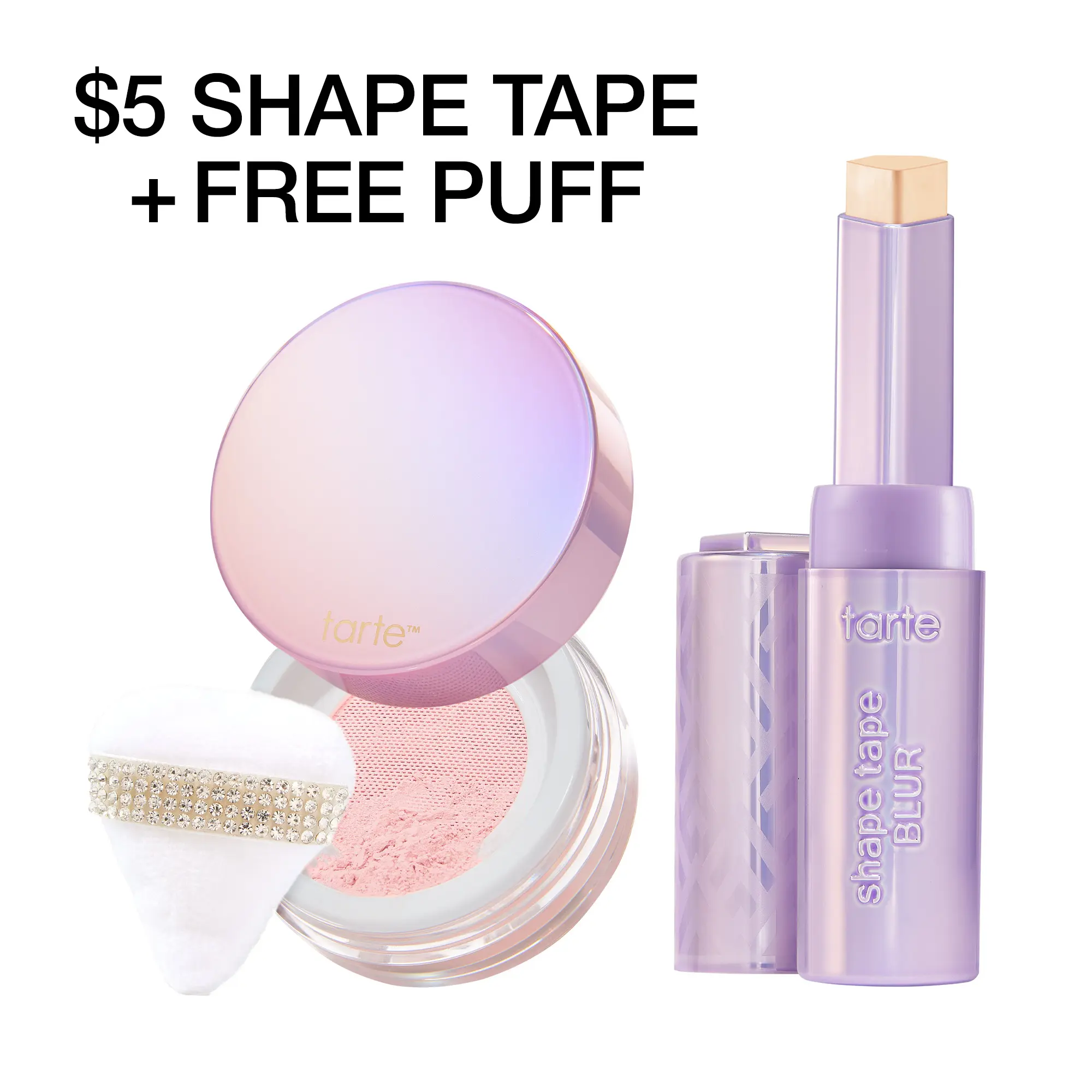 Get the #1 concealer brand's* shape tape stick for only $5 & FREE bling puff with the limited-edition creaseless setting powder. #trippinwithtarte's hack for a full day of flawless!