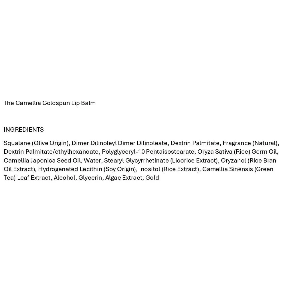 The Camellia Goldspun Lip Balm is an intensely hydrating lip balm rich in camellia oil that absorbs quickly, leaving lips soft and touchable with a hint of 23K golden shimmer.