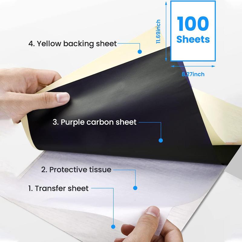·4-ply Transfer Paper: Layer 1 white master sheet to which the design is applied; Layer 2 semi-transparent protective tissue to be thrown away before use; Layer 3 blue carbon page; Layer 4 yellow backing sheet(If you use Phomemo M08F stencil printer, you need to tear it off). Size 8.27" X 11.69" (210 mmX297 mm)which can be cut down into smaller sheets for more use