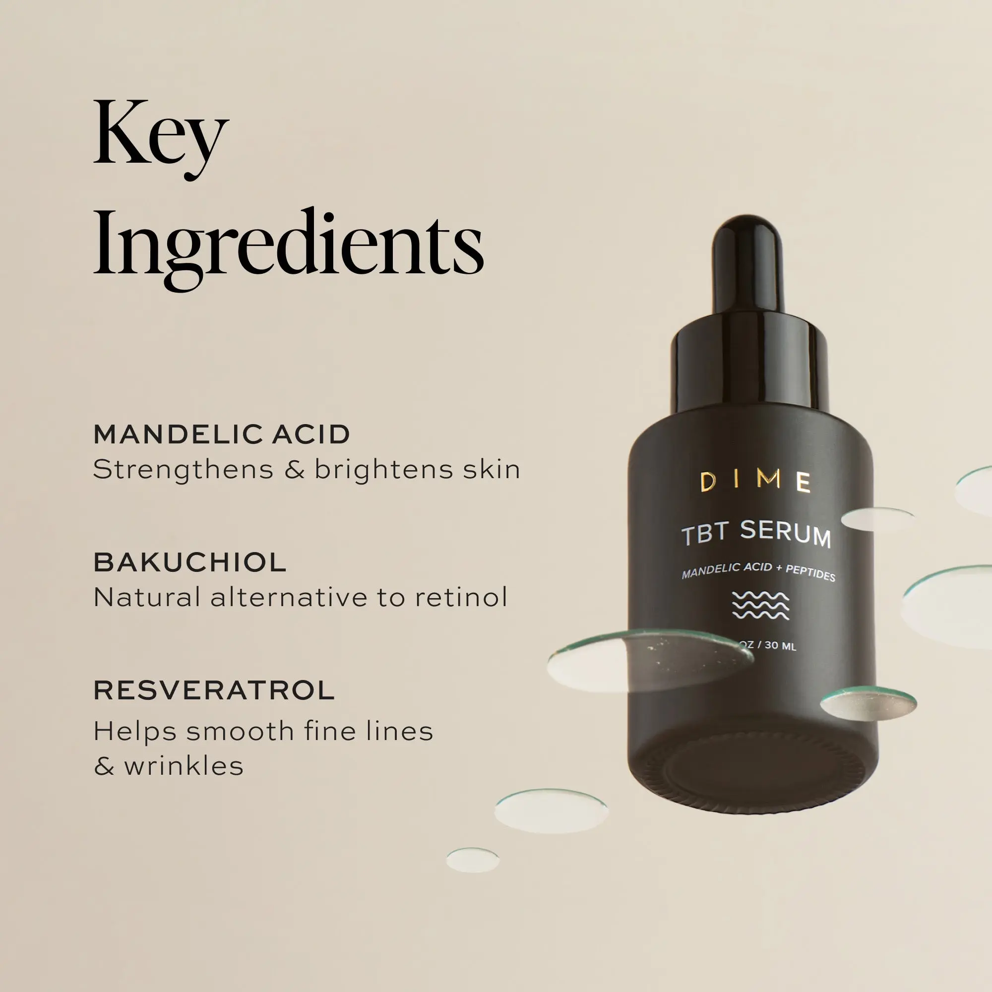 Say goodbye to old, dry skin and hello to newly hydrated, youthful skin! Change your skin for the better with our TBT® Serum, a hydrating leave-on exfoliant that does the work overnight, so you don't have to! This serum is supercharged with Mandelic Acid, Niacinamide, and other powerhouse anti-aging ingredients.