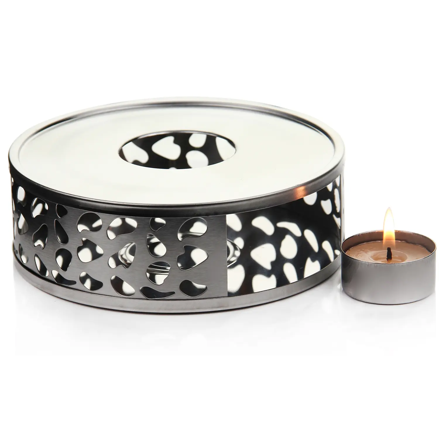 Tea Warmer made from durable and rust-free stainless steel. Fits most teapots (5.9 in / 15 cm diameter). Comes with one tea light candle; One tea light candle can warm your tea for hours over a soft, flickering glow of candlelight.