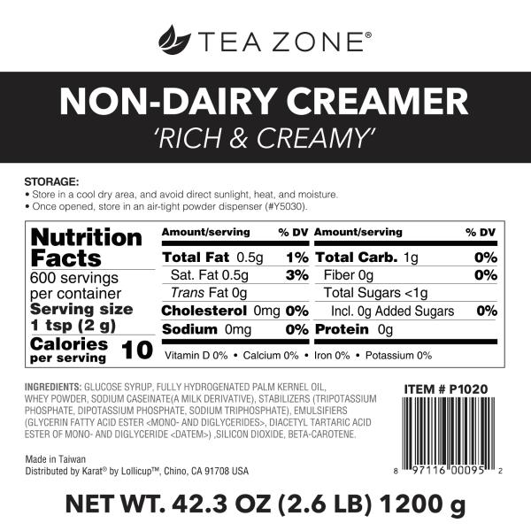 Tea Zone Non-Dairy Creamer "Rich & Creamy" is our original premium powder creamer used as a base for smoothies and milk teas. To ensure uncompromised and sanitary usage, powders should be store in a vacuum sealed power container and always use a dry, clean powder scoop.