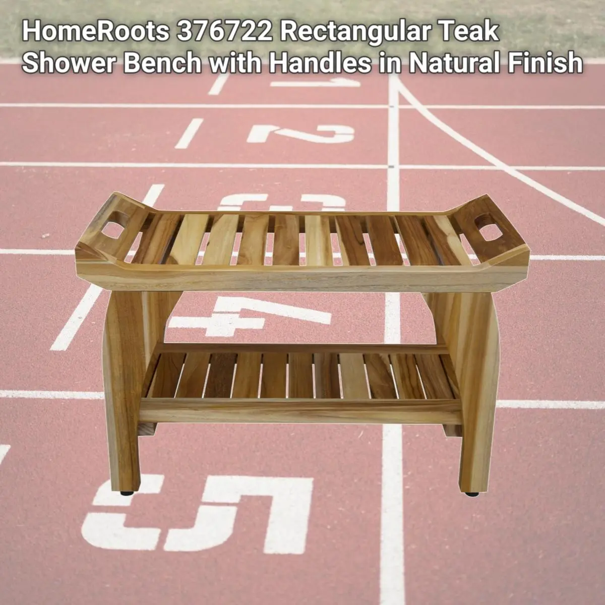 HomeRoots Rectangular Teak Shower Bench with Handles in Natural Finish