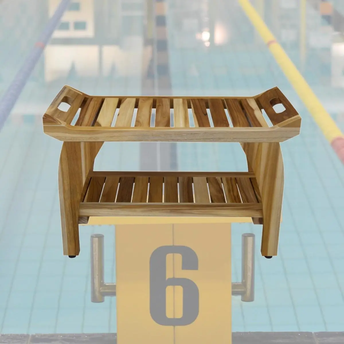 This 29" length classic traditional teak shower bench with cut out handles offers practicality mixed with a contemporary design flair. The included standard utility shelf provides extra storage for toiletries, towels, or supplies. This compact size of 29" length x 14" width x 18" height provides a compact footprint that will fit in most tight areas. The cut out handles add stability and aid in steadiness when getting on and off of the bench. These stools include foot leveling pads to provide extra flexibility and stability to allow stabilization due to any minor slope, and uneven surfaces, like shower floors. The sturdiness of teak provides the ability for this teak furniture to be used outdoors as well as indoors. Features Adjustable Height with Rubber Feet. Assembly Required. Water Resistent. Specifications Height: 20 Inches. Width: 14 Inches. Depth: 30 Inches. Material: Teak. Color: Natural Brown. Finish: Natural Wood Finish. Country of Origin: Indonesia. Weight: 20 lbs.