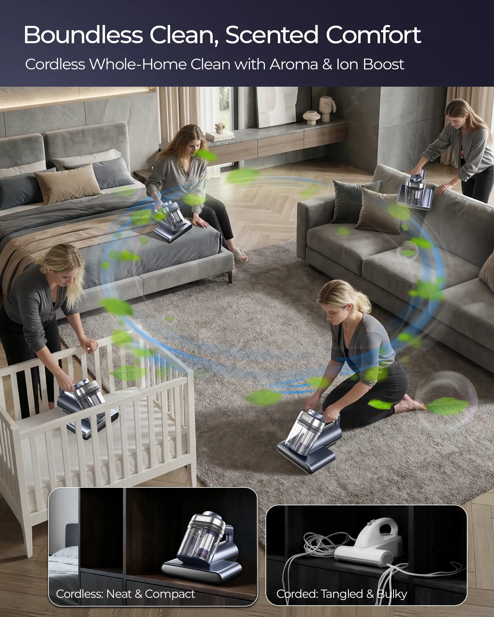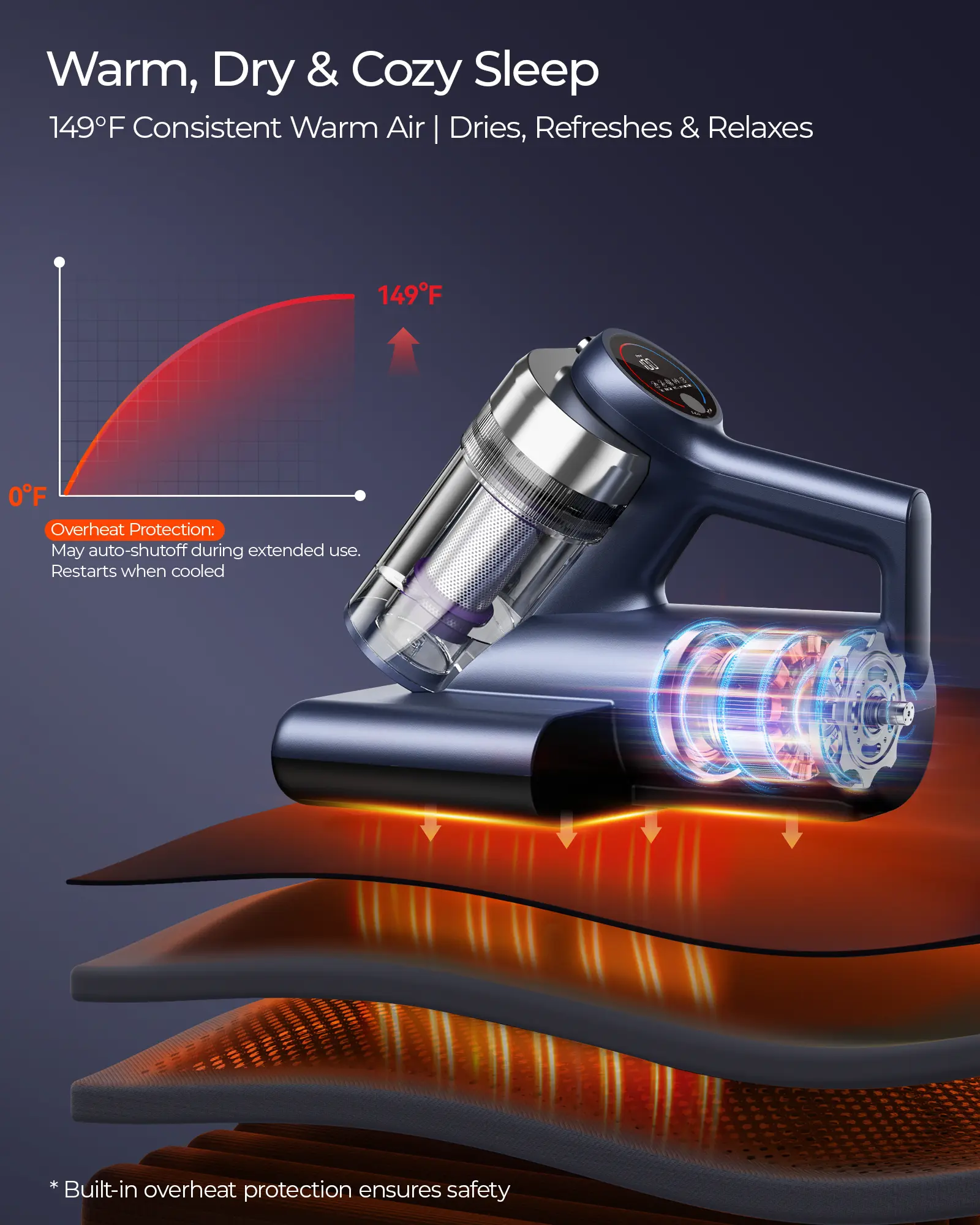 Dry, purify, and refresh your bedding in one step! Designed as a UV mattress vacuum cleaner with added comfort care, 149°F warm airflow removes moisture for dry, skin-friendly fabrics, negative ions lift airborne dust, and aroma adds a subtle, soothing scent for a clean, cozy space your whole family will love