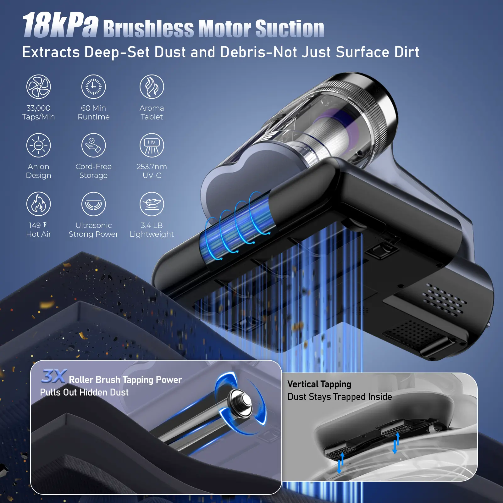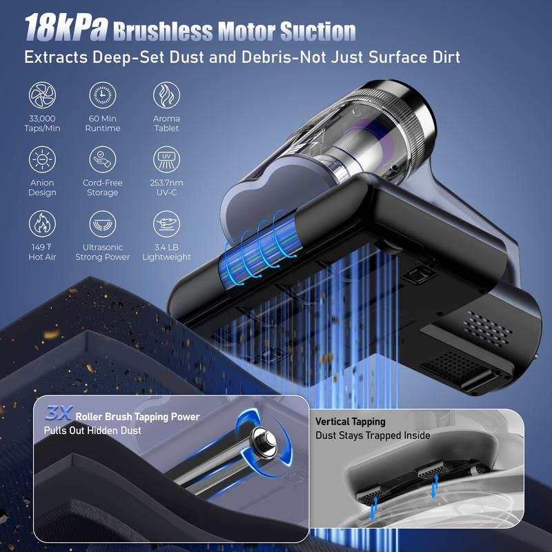 18,000Pa Suction Power: Ultra-strong 18,000Pa suction removes embedded mites, dust and allergens from deep within fabrics