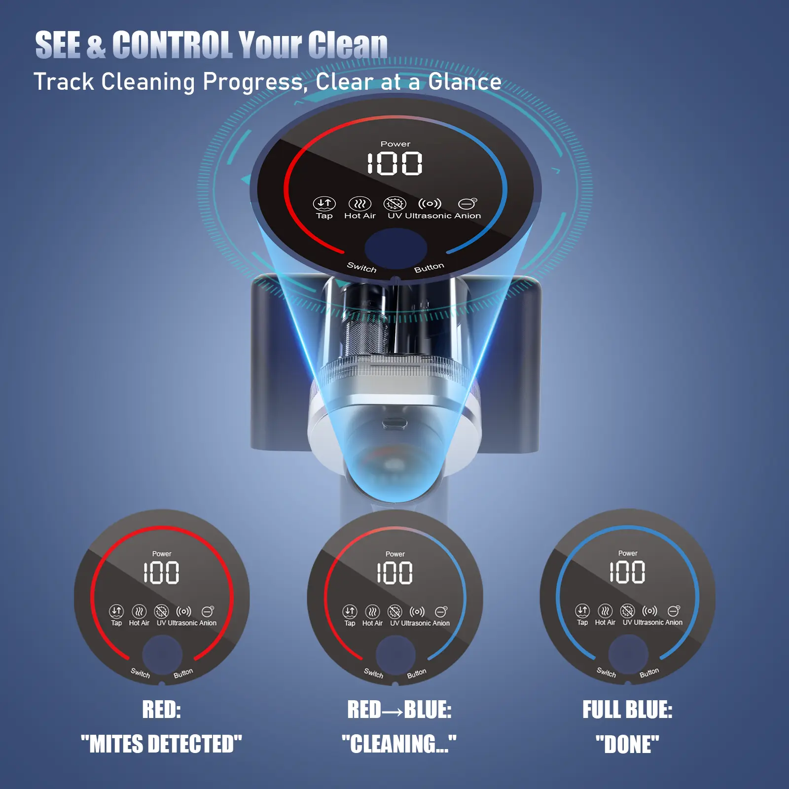 Real-Time Progress Indicator: Smart color-changing display (RedBlue) shows cleaning status at a glance