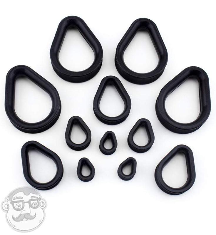 Kaos Black Silicone Teardrop Eyelets are made with the highest quality implant grade silicone and manufactured in the USA. Perfectly sized, this two-piece pair comes in sizes 00G gauge up to 1 & 1/2" with a 8mm (5/16") wearable surface from 00G to 1 inch and 10mm (3/8") wearable surface from 1 & 1/8" to 2 inch. Soft and squishy, they can be washed with a mild non scented antibacterial soap and water. Note: these teardrop eyelets are not suitable for ear stretching.