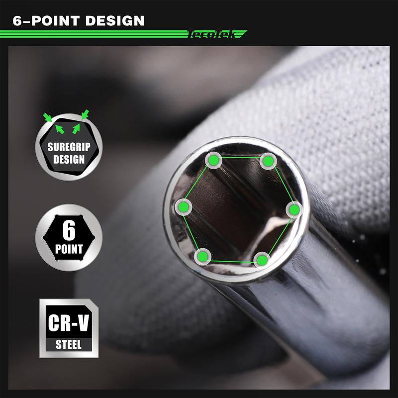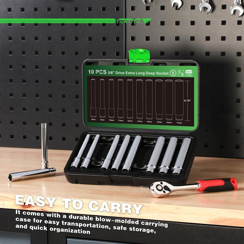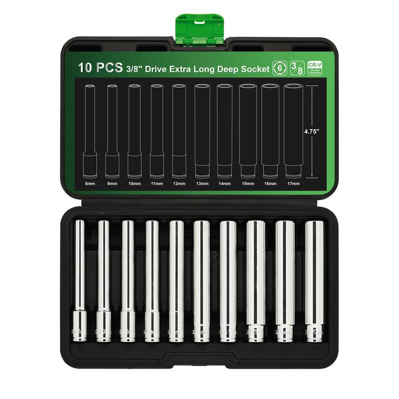 5. 10PCS 3/8-Inch Drive Extra Deep Metric Socket Set, 6 Point, 8mm to 17mm, No Skipped Sizes, 120MM Deep CR-V Socket for Automotive and Industrial Applications