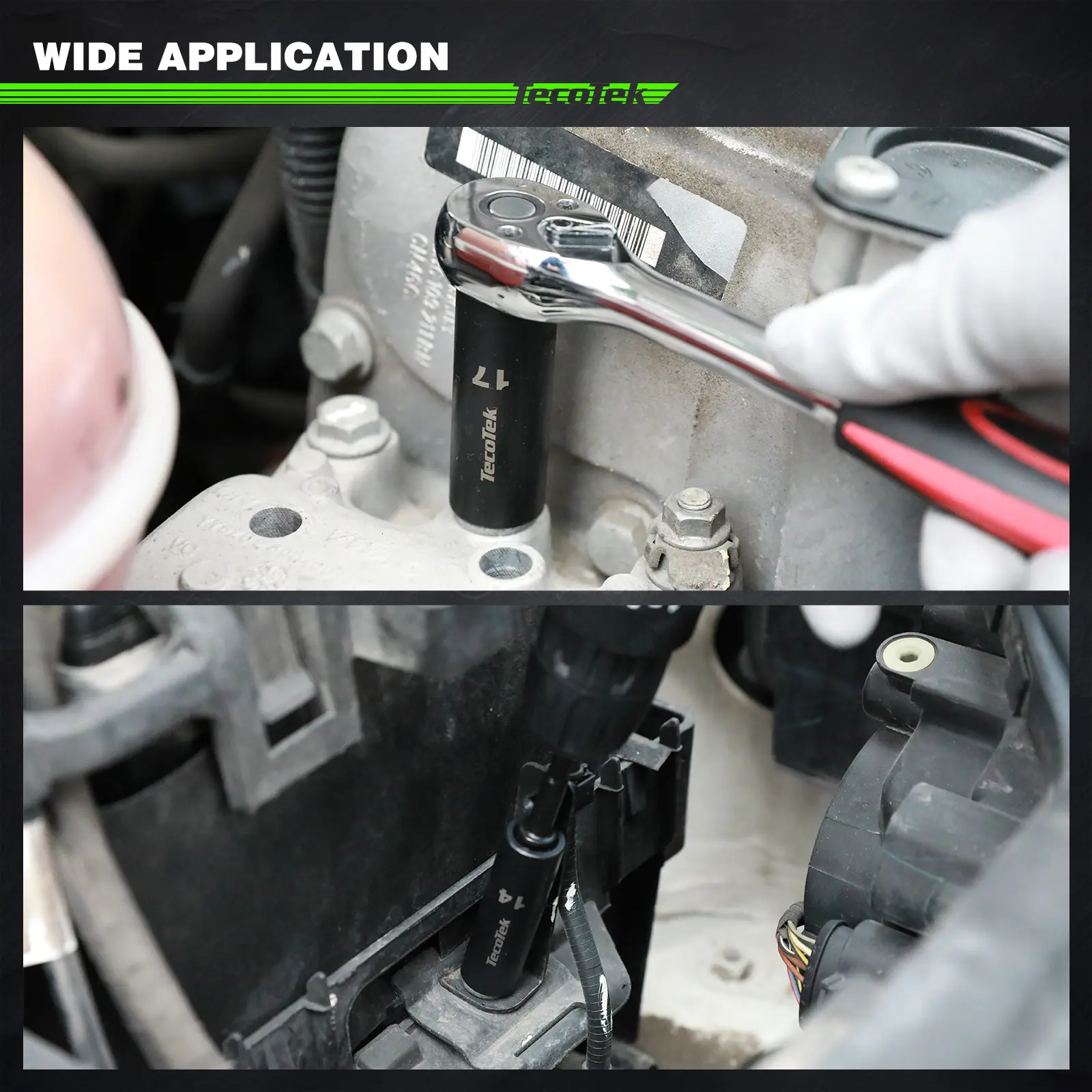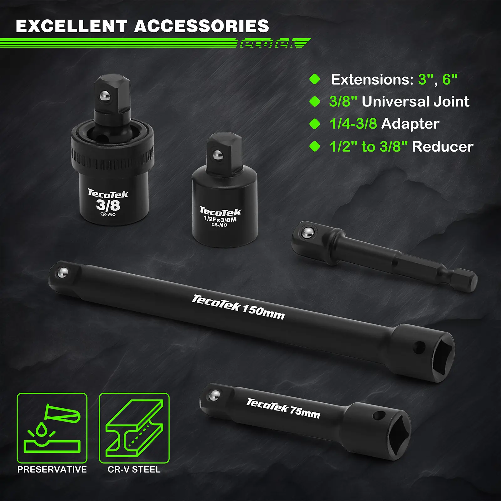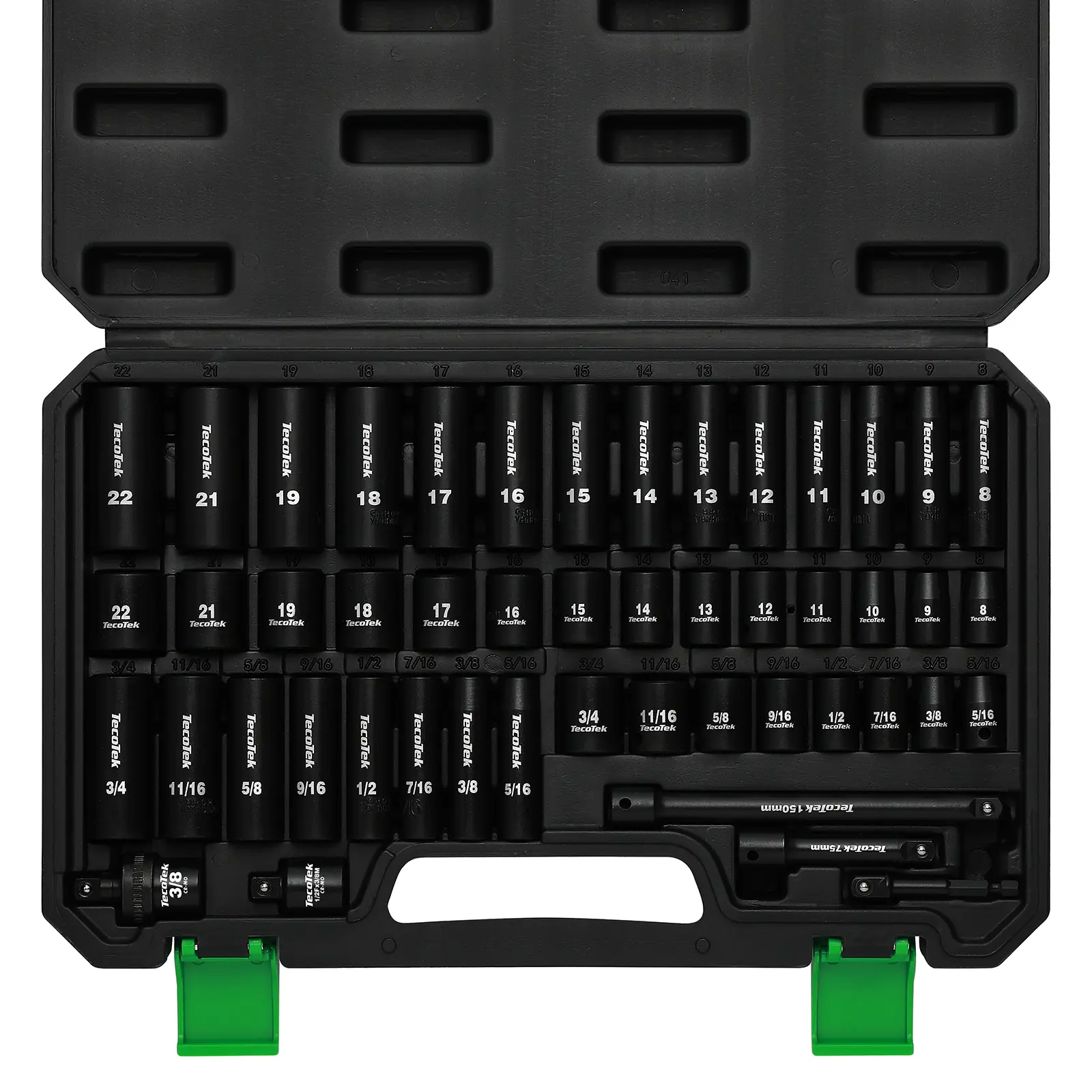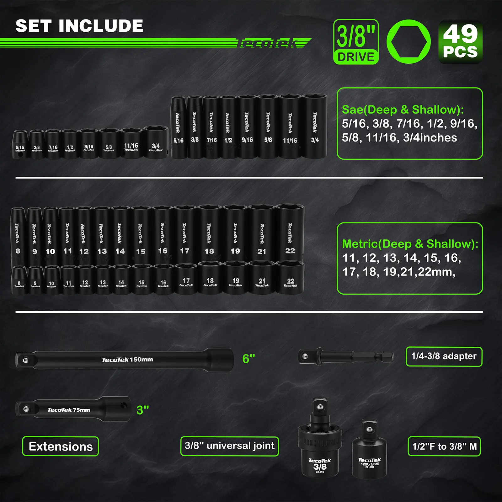 This comprehensive set includes 49 pieces in SAE (5/16"-3/4") and Metric (8mm-22mm). It features 6-point sockets made from Cr-V steel. The set comes with extension bars, a 1/2" F to 3/8" M reducer, a universal joint, and a power drill adapter. Perfect for versatile applications.