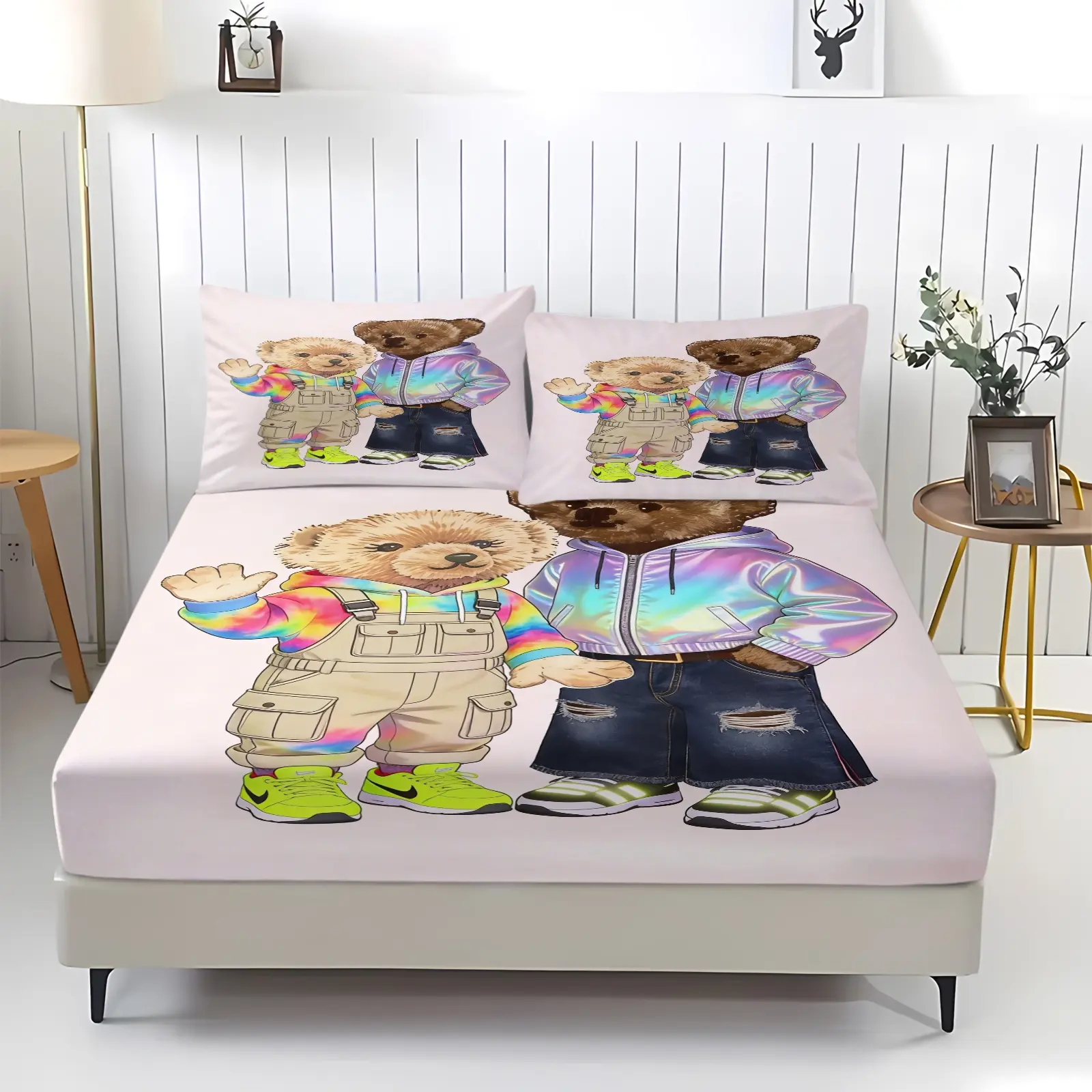 Teddy Bear Flower Pattern Bed Sheet, Comfortable Printed Pattern, Includes 1 Bed Sheet and 2 Pillowcases, Comfortable Bedding, Non slip Dust Cover Suitable for Bedroom and Guest Room, Suitable for Adult Gifts