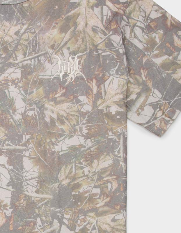Lira Woodland Camo Embroidered Tee. Allover camo pattern. Logo embroidery at left chest. Side seam flag label. Crew neck. Short sleeve. 100% Cotton. Machine wash. Imported.