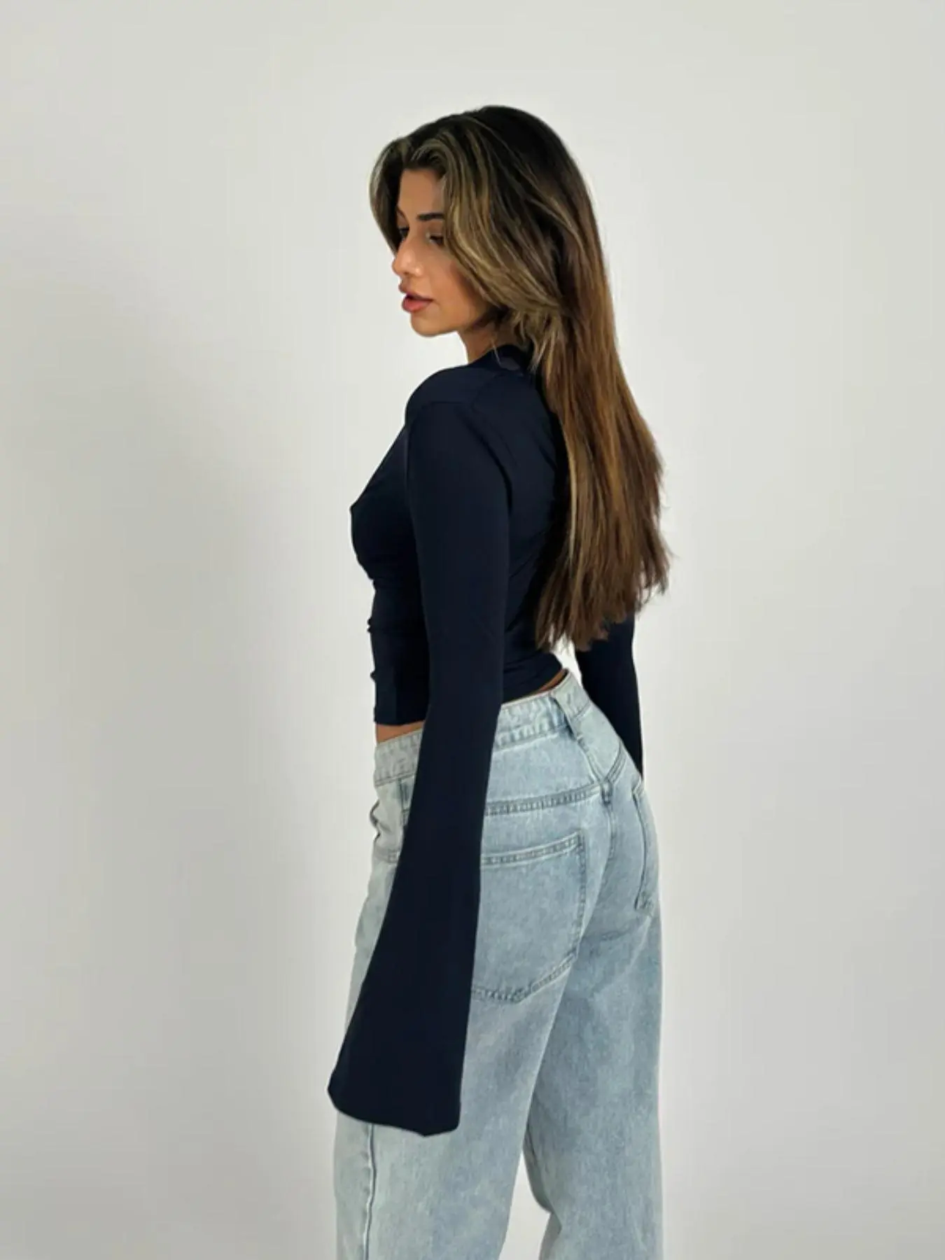 4 my tall girls, this top is for u. I’m 6’ & struggle finding a top w/ sleeves that are long enough to reach my wrists. This is the first top I’ve gotten in a long time where the sleeves reach my palm. fast shipping too! there is a little tummy action but if u don’t mind that, it’s perf. I love her