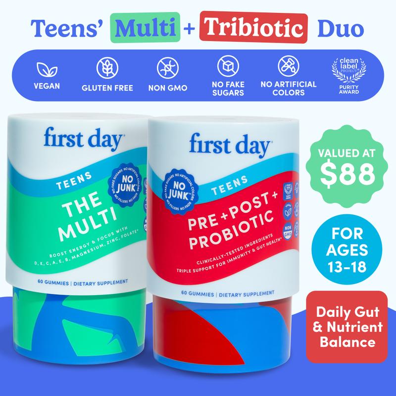 Our highly requested Teen Multivitamin PLUS our new Teen Tribiotic – the World’s First Teen Pre+ Post+ Probiotic. 30 day supply of gummies for ages 13+.