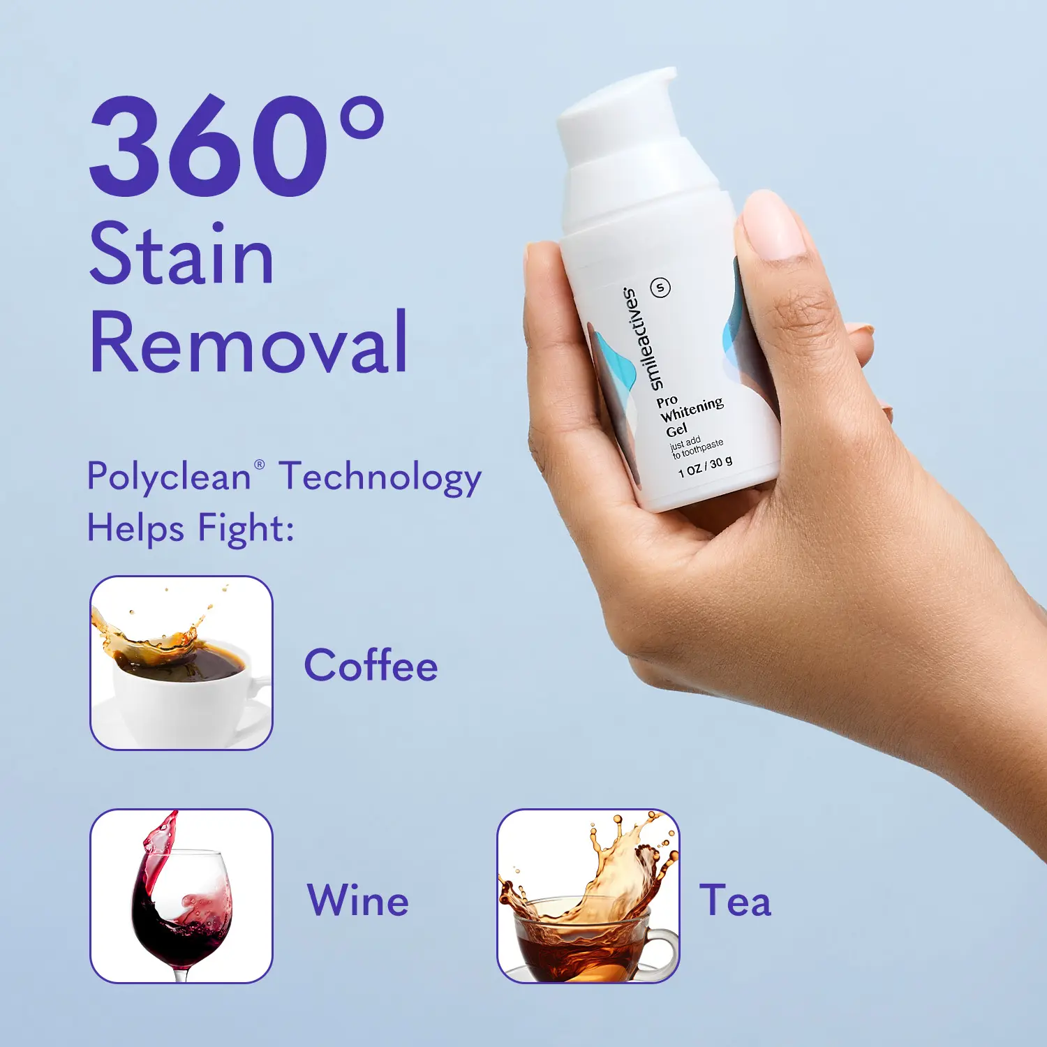 Unlike your ordinary teeth whitening strips or teeth whitening pen. Smileactives teeth whitening gel works to whiten the whole tooth, not just the front. The pioneering Polyclean technology generates an ultra-fine teeth whitening foam which carries the whitening ingredient into the hard-to-reach grooves and crevices of your smile for 360° stain removal.