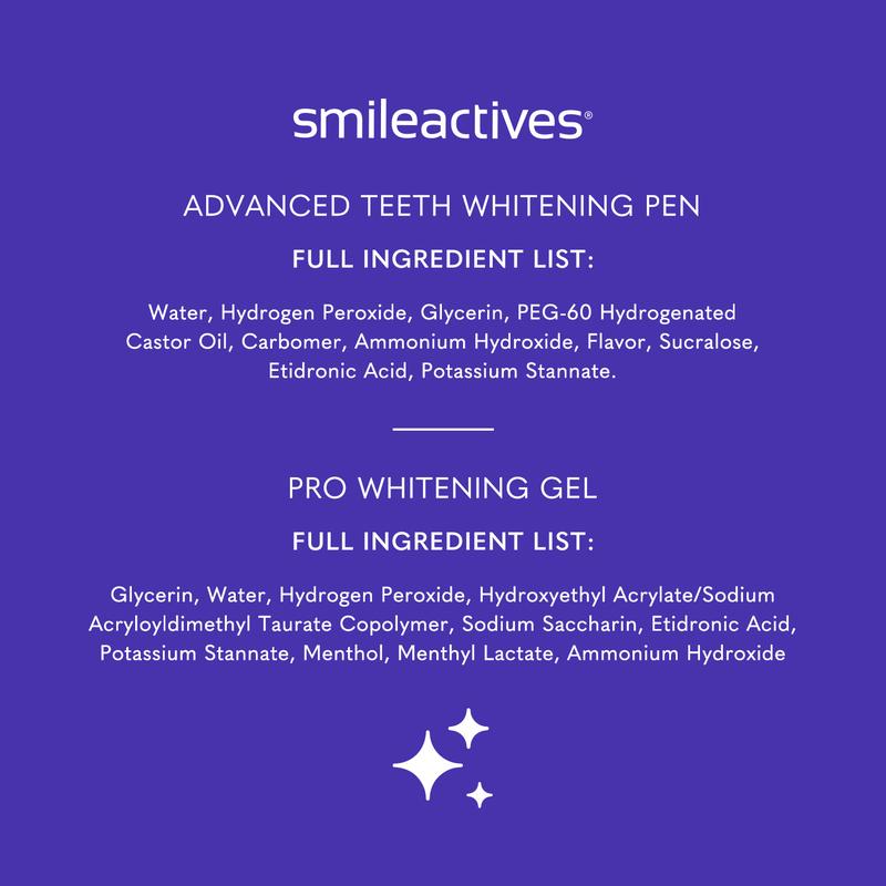 Enhance your confidence with a whiter smile! Smileactives whitening kit helps you achieve clinical-grade whiteness at home. Our Pro Whitening Gel penetrates the enamel pores to help lift and remove stains while the Advanced Teeth Whitening Pen maintains whitening and stops setting of new stains. Experience a long-lasting whiter smile with the help of this Power Duo.