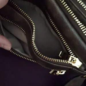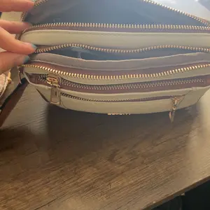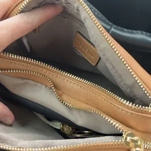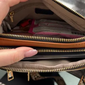 It features 2 large zippered compartments, 1 inner zip pocket, 2 front zip pockets, and 5 card slots—replacing the need for a wallet.