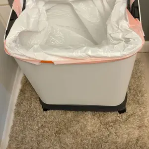 It’s very hard to put a garbage bag I love the fact that the big one has wheels and also that it turns big but it’s so difficult to put a garbage bag in