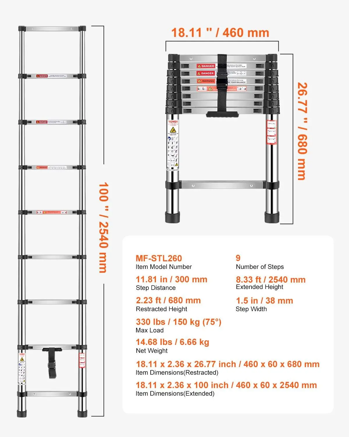 ·Versatile Design: This telescopic ladder offers a retractable design that allows for manual height adjustment. When fully extended, it reaches 8.33 ft, and when contracted, it is just 2.23 ft in height
