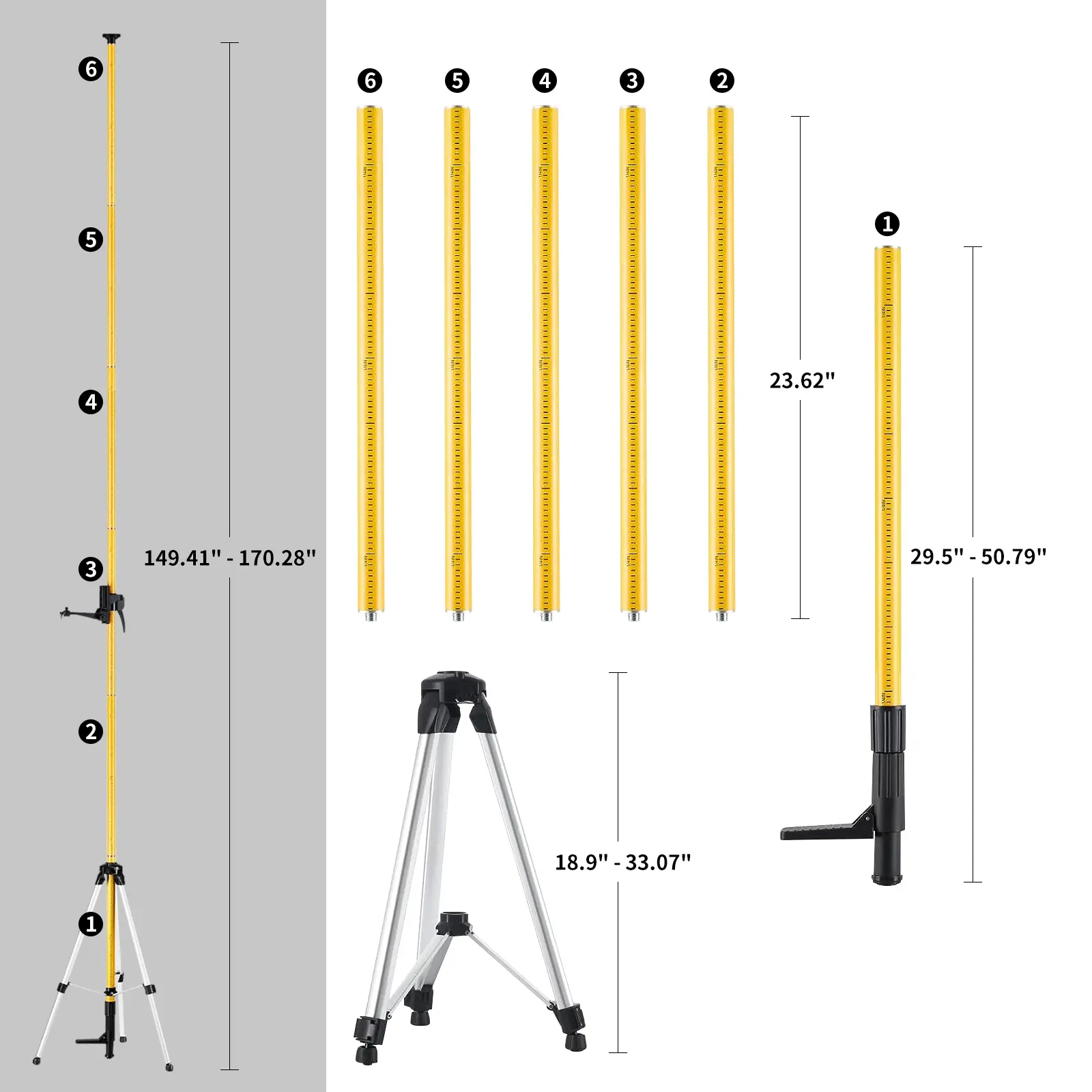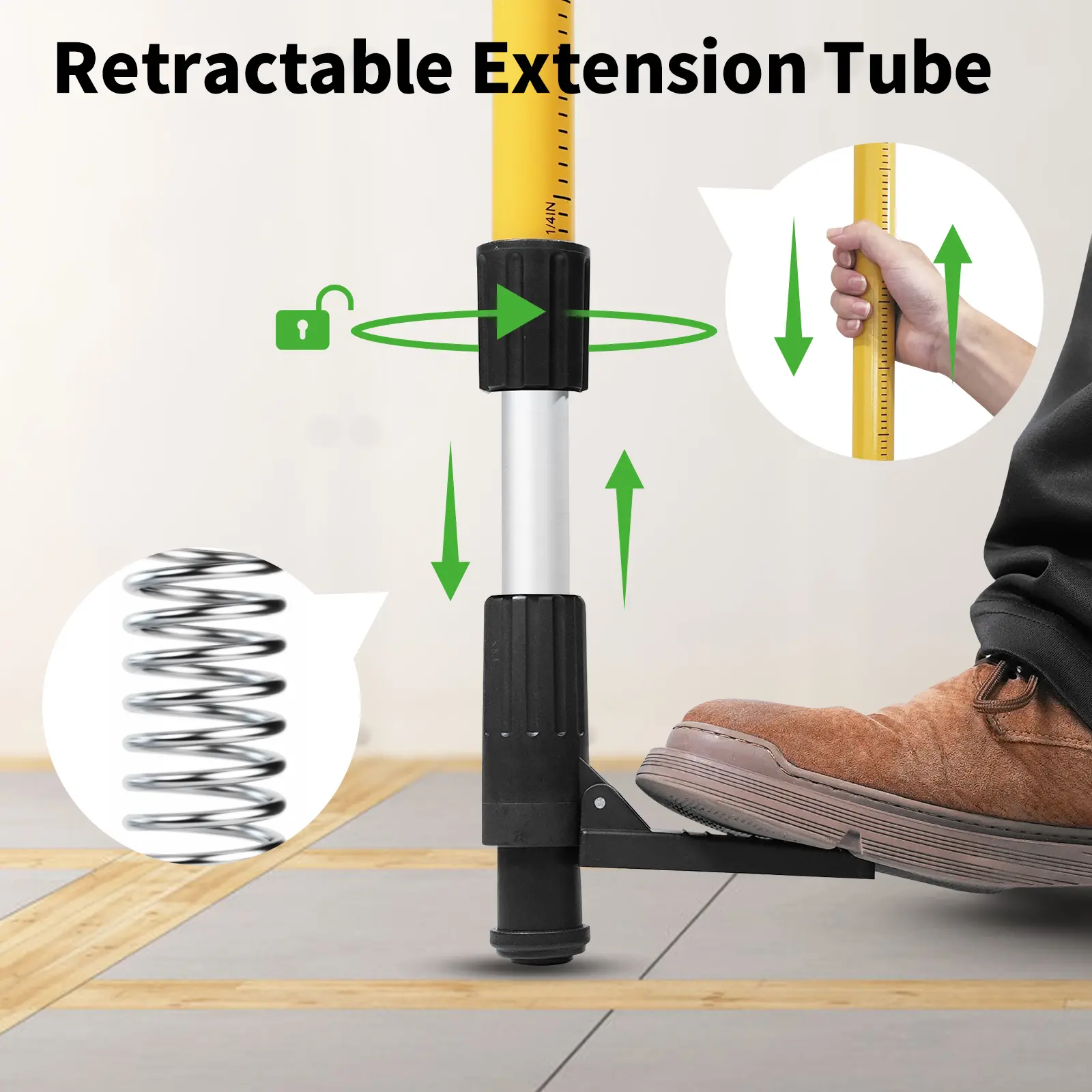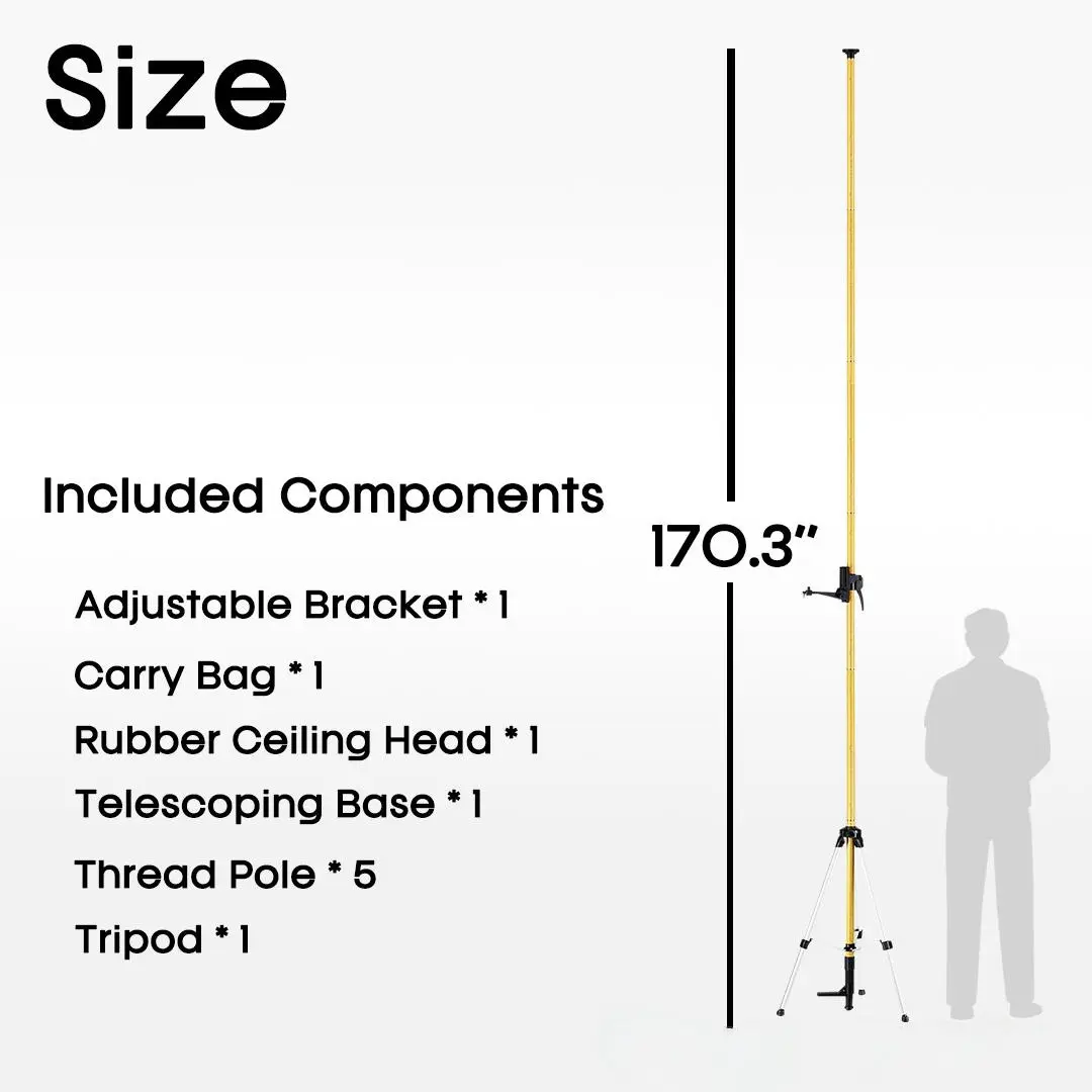 ·13.8 Ft Telescoping Pole: The adjustable laser level pole boasts a total length of 13.8 feet (4.2 meters), composed of 5 telescopic rods and 1 telescopic tail rod. This allows for height adjustment tailored to your specific needs and floor height.