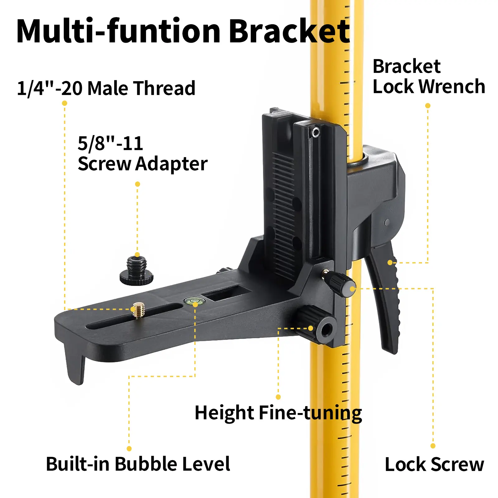 ·Precision Fine-Tuning Bracket: The bracket includes a 1/4" thread and a 5/8" thread adapter, ensuring compatibility with a wide range of laser levels. Its adjustable design lets you position the bracket at your desired height. Plus, the fine-tuning knob allows for meticulous adjustments, offering a height range of 2.7", a depth of 2", and 360° rotation.