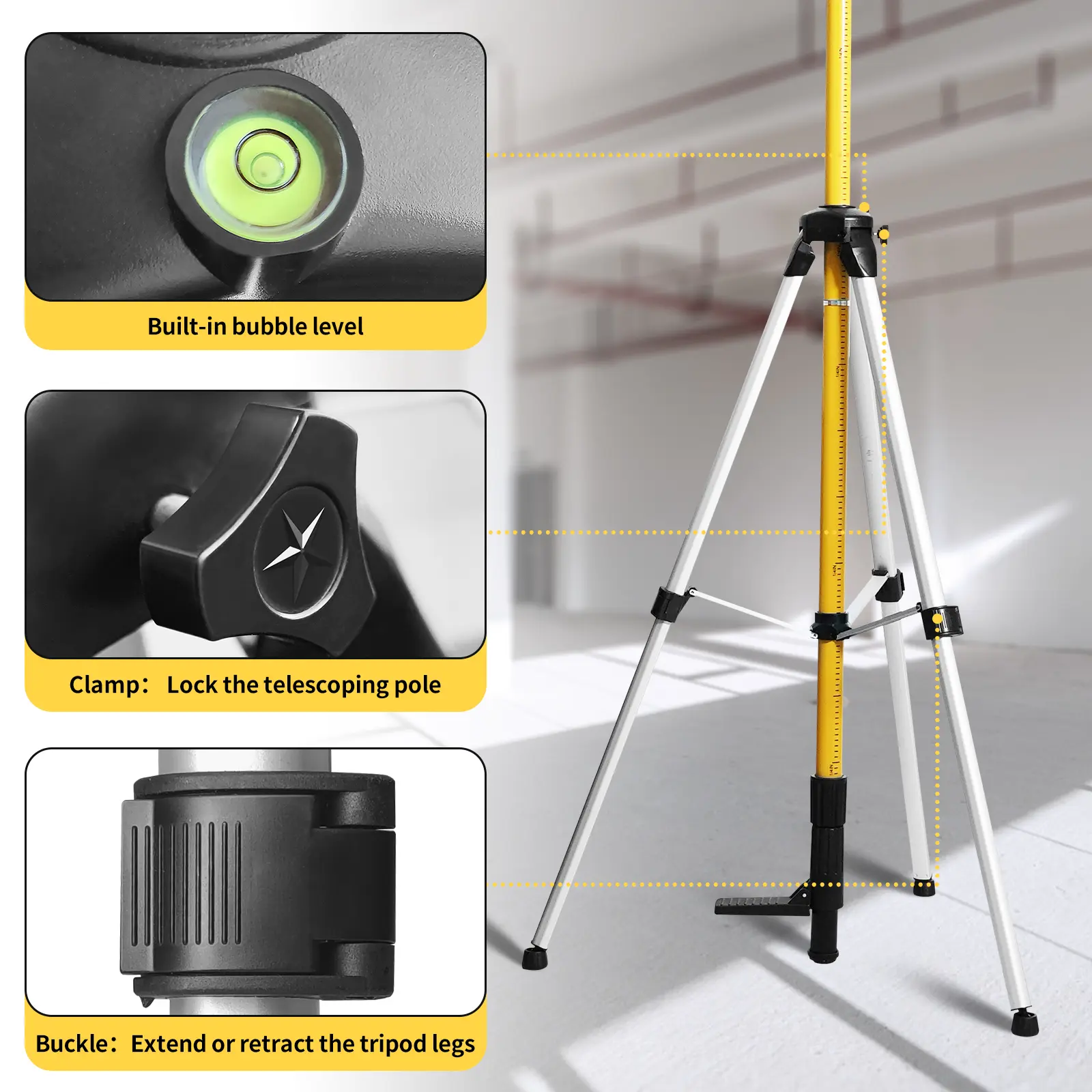 ·Versatile Placement Options: Equipped with a retractable tripod, this level tool offers stability when used at elevated heights. Alternatively, you can opt to use the pole standalone. The ceiling head securely holds the rods in place while safeguarding both the rods and the ceiling.