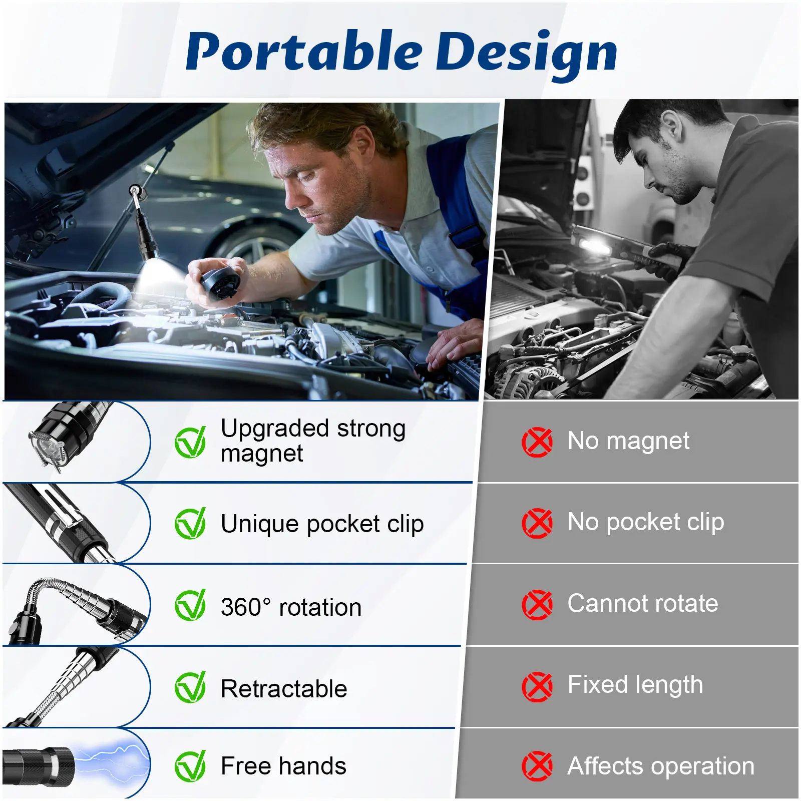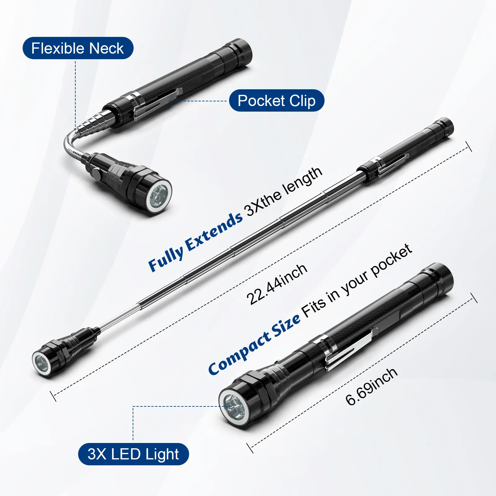 【Adjustable and Flexible】Our telescoping magnetic tool boasts an extendable neck that reaches up to 22 inches, with the ability to rotate 360º and adjust angles. Designed for maneuvering in hard-to-reach places, it is an essential tool for working in garages, corners, or tight spaces. This feature makes it a game-changer for any task that requires precision and reach.