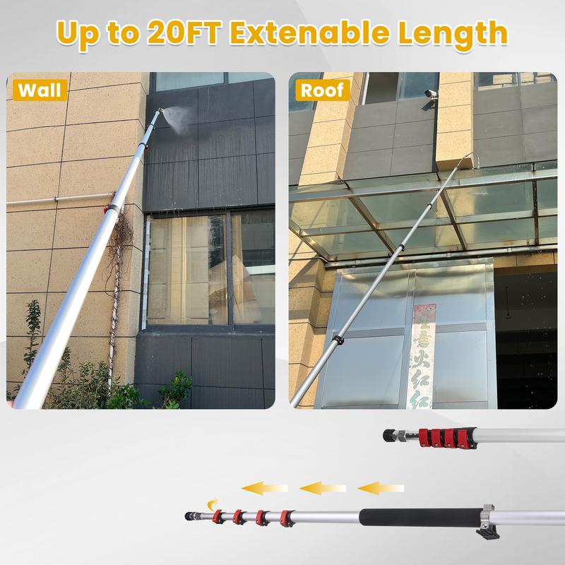 • Made of durable aluminum, stainless steel, and brass. Easy assembly and disassembly. Extend from 5 ft to 20 ft, reaching tall areas safely. This wand is ideal for thorough cleaning tasks, ensuring efficiency and effectiveness in various settings.