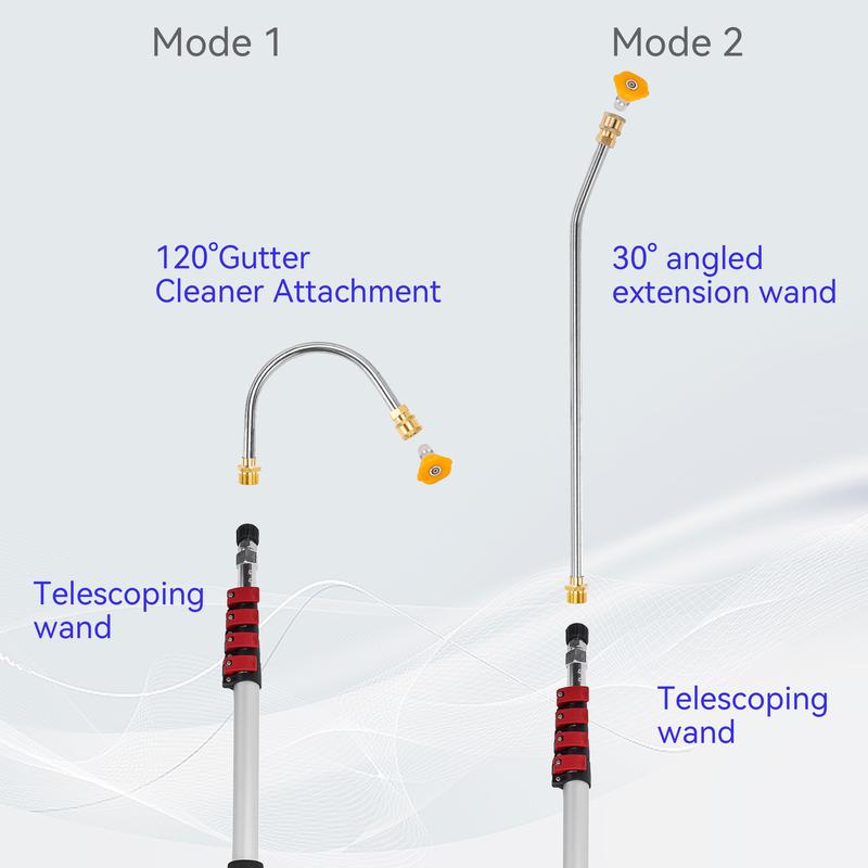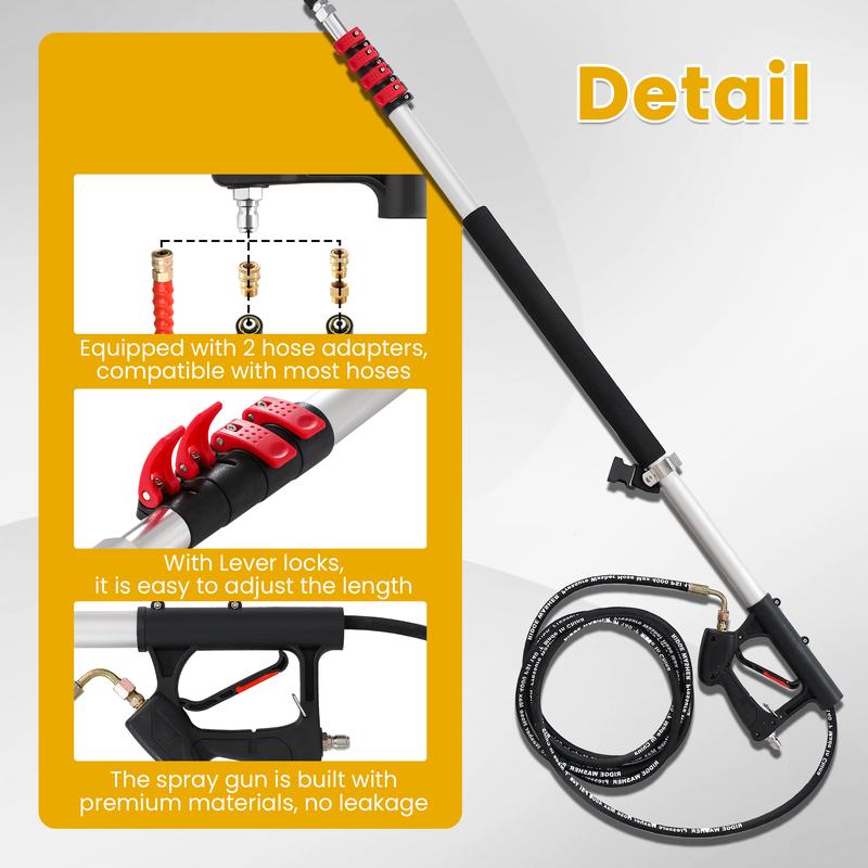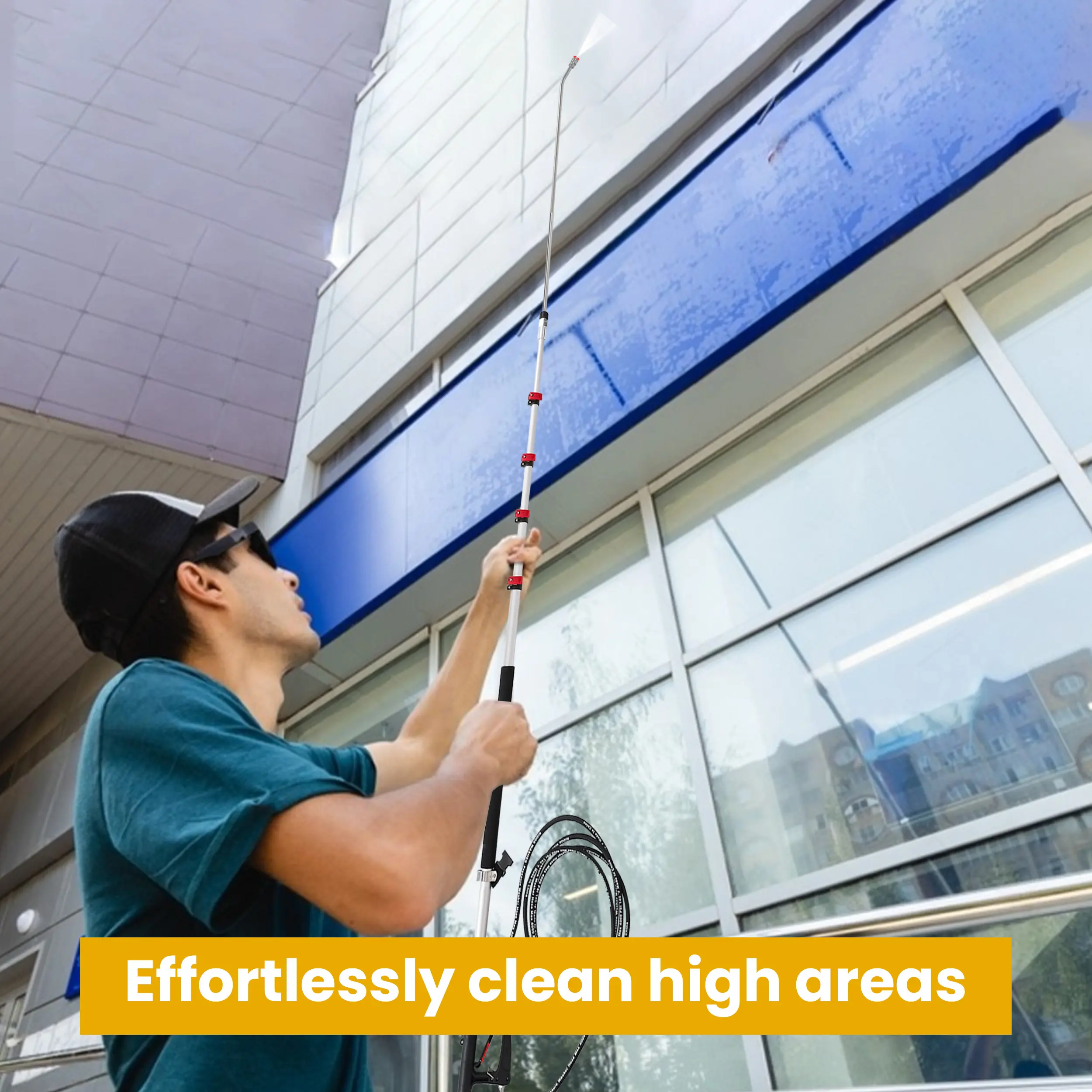 • Angled extension wand for power washer and gutter cleaner. Use safely from the ground. Reach hard-to-reach places effortlessly. Perfect for cleaning pavements, roof gutters, and soffits without ladders. Strong telescoping design with a level lock ensures stability.