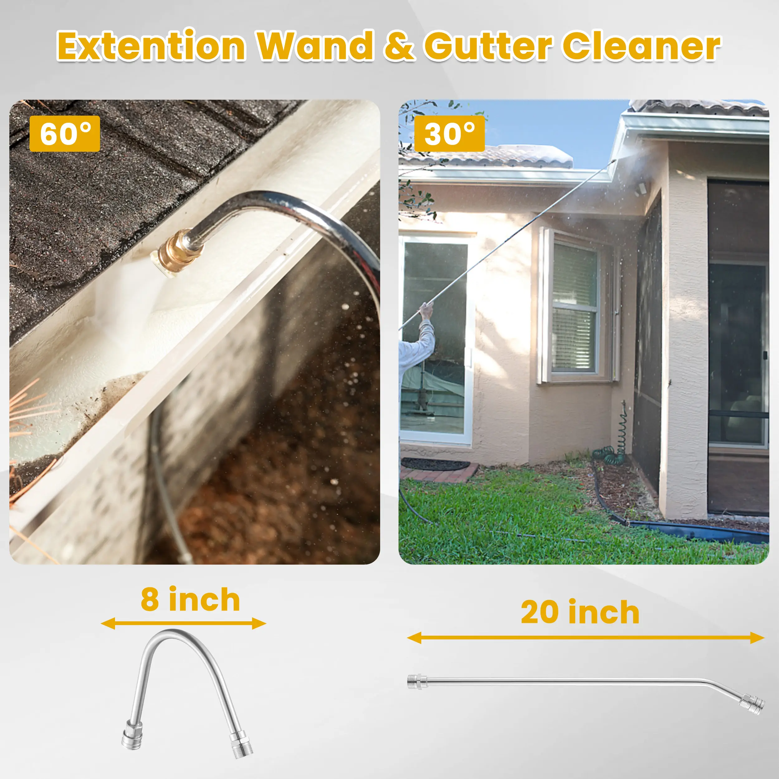 • 1 x 20" 30° angled wand, 1 x 60° gutter cleaning attachment, 1 x adapter, 1 x coupler, 1 x support belt, 1 x allen wrench, and 5 nozzle tips. M MINGLE offers professional pressure washer accessories. Contact us for any questions.