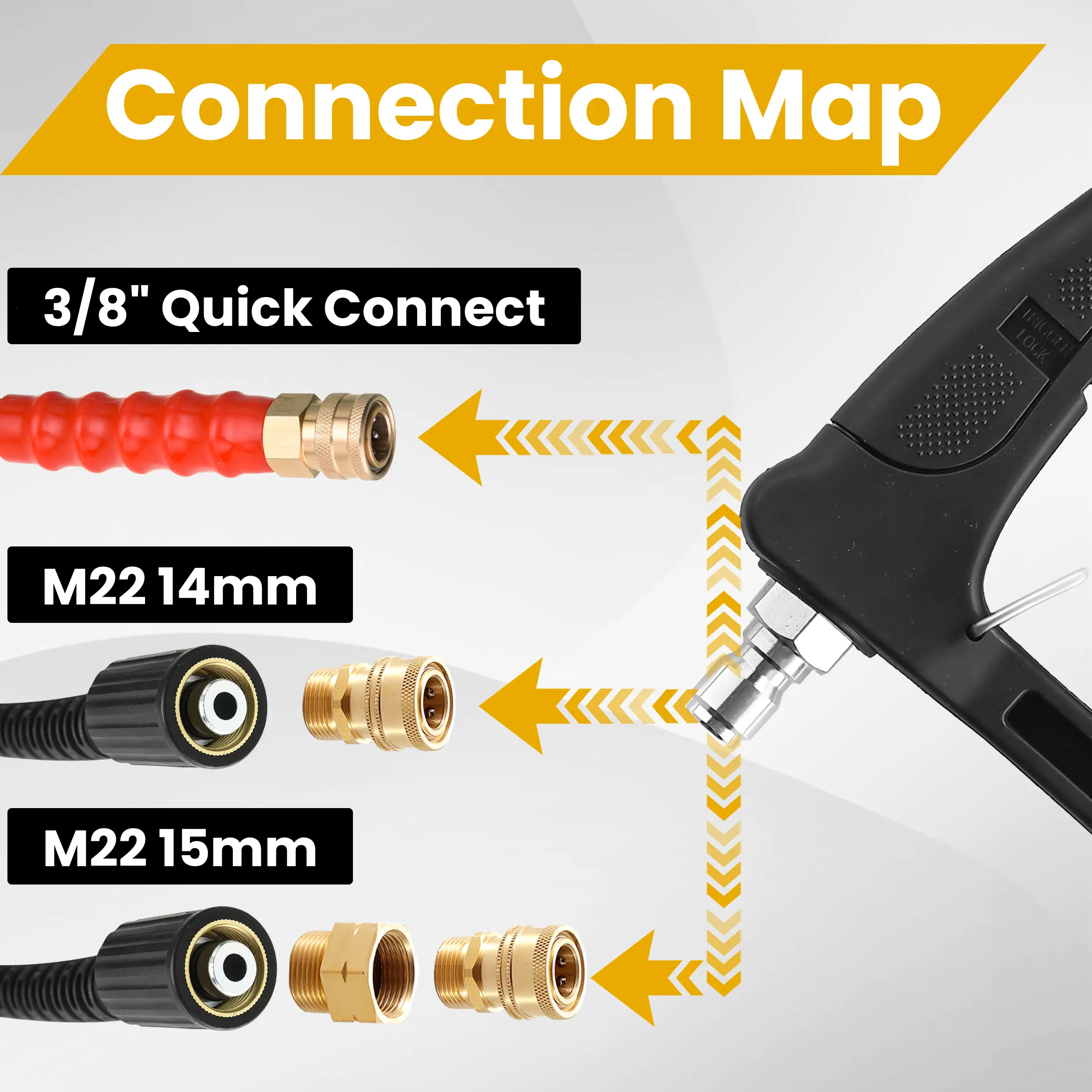 • Works with gas and electric pressure washers up to 4000 PSI. The 3/8" quick plug inlet fitting converts to M22 14mm or 15mm. Fits most pressure washer hoses, ensuring broad compatibility across different models.