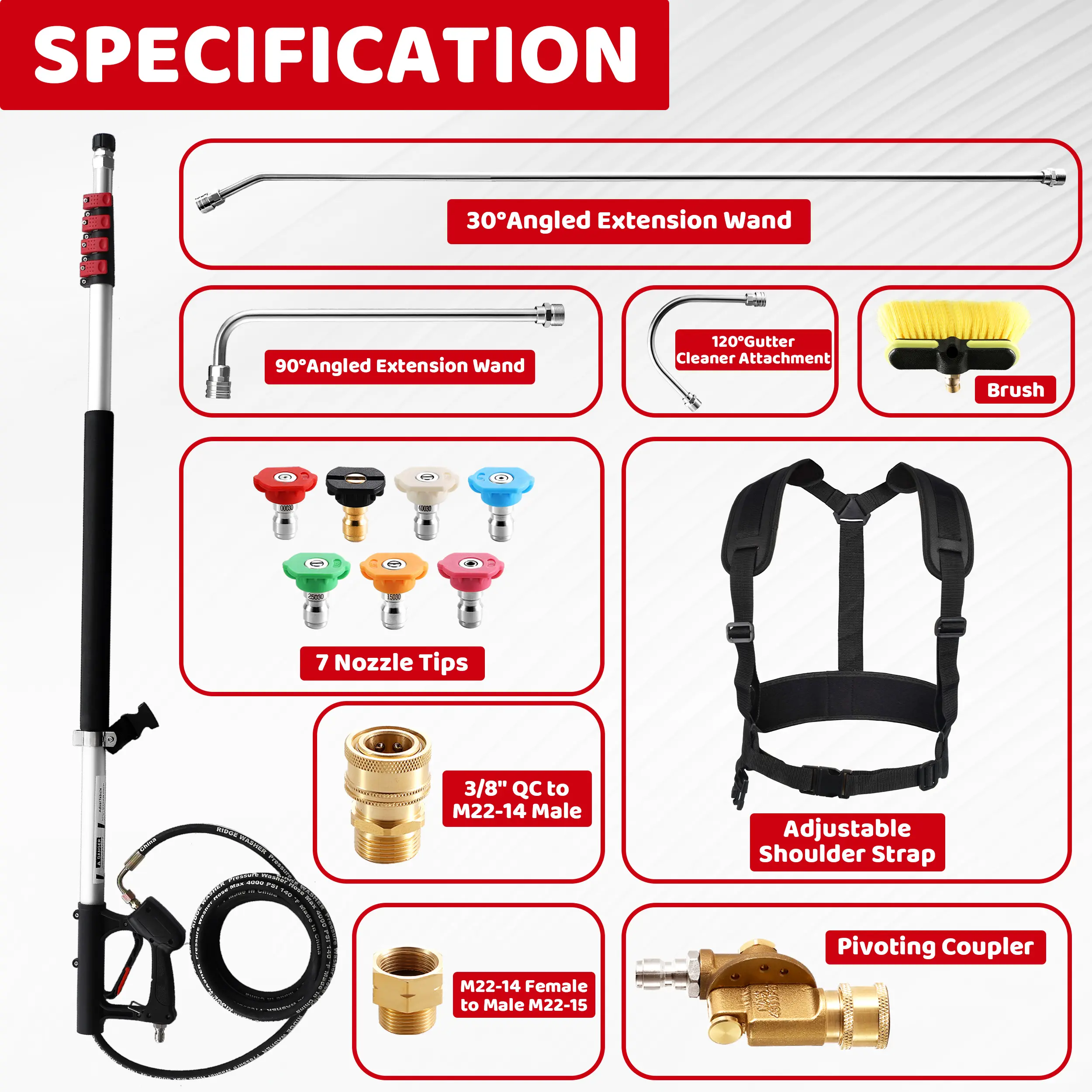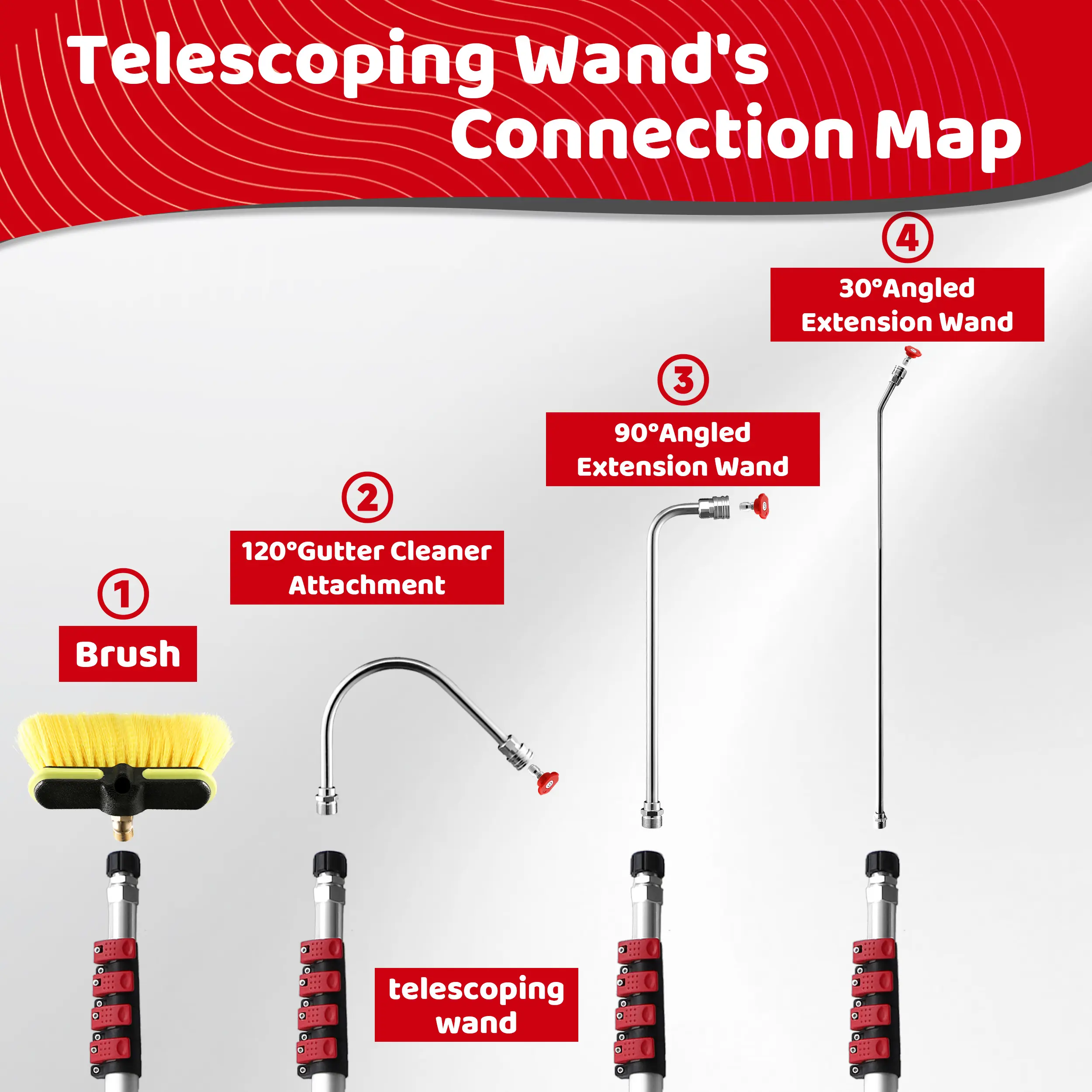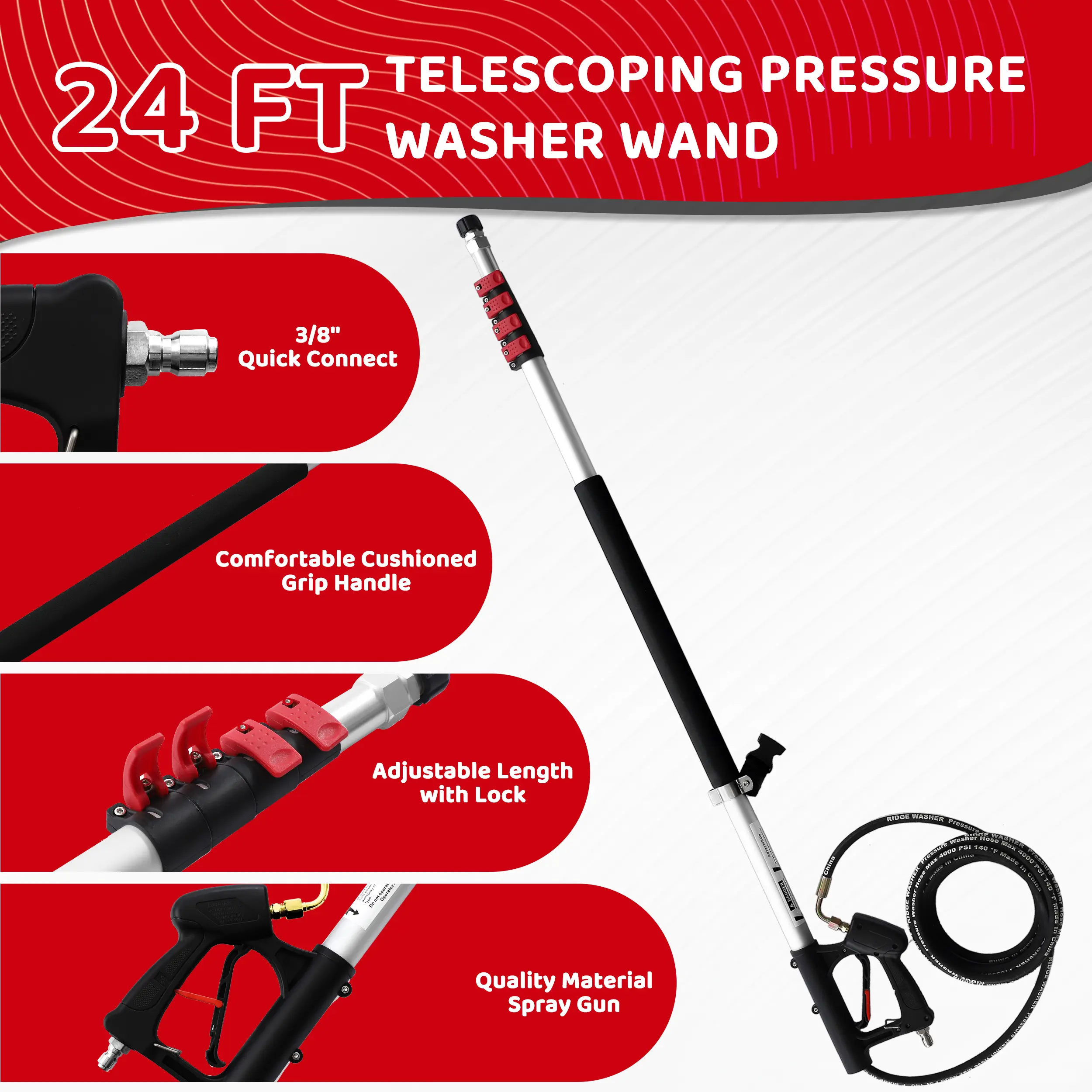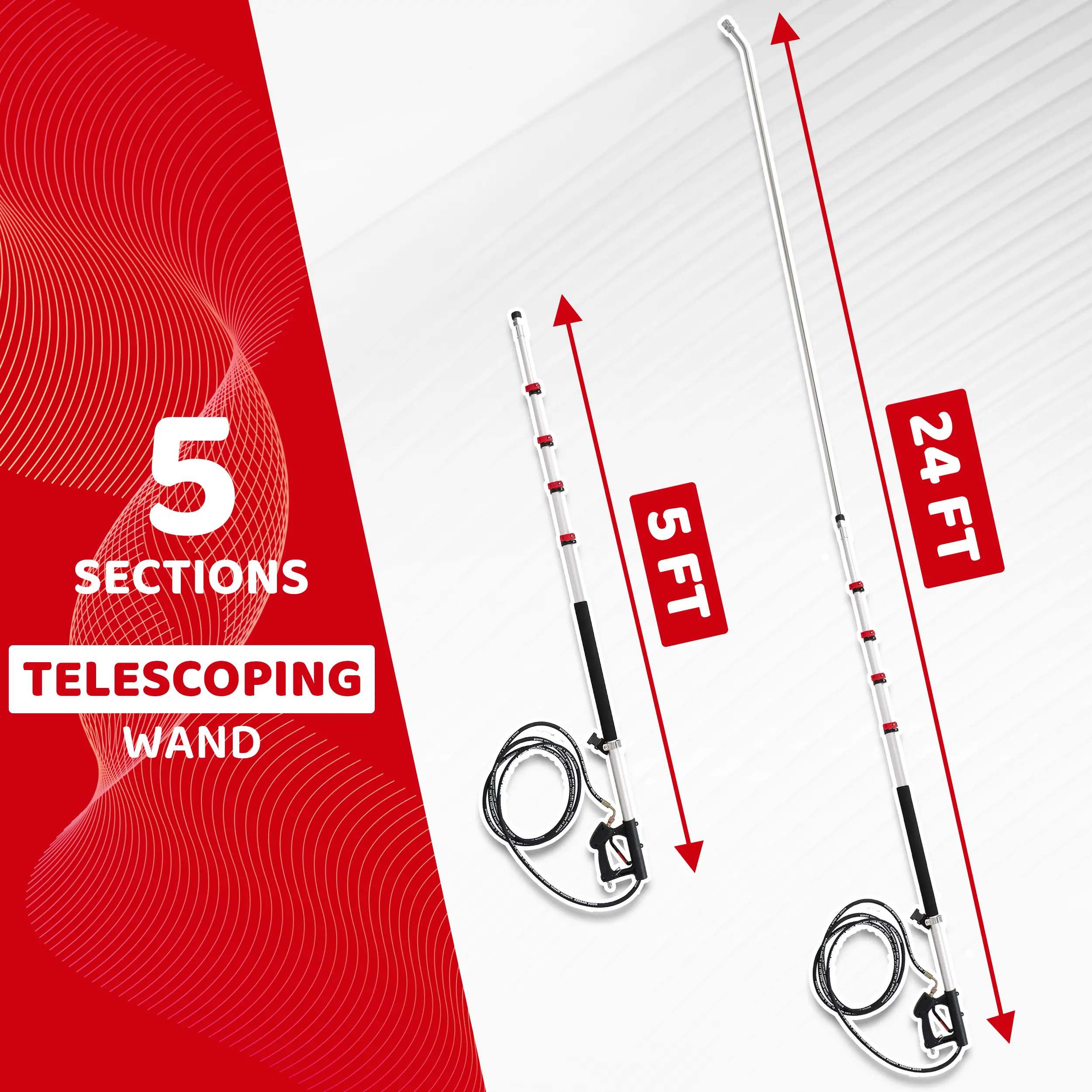 ·24 FT Telescoping Pressure Washer Wand: Ideal for reaching hard-to-reach areas, making it perfect for cleaning roofs, gutters, and tall buildings.