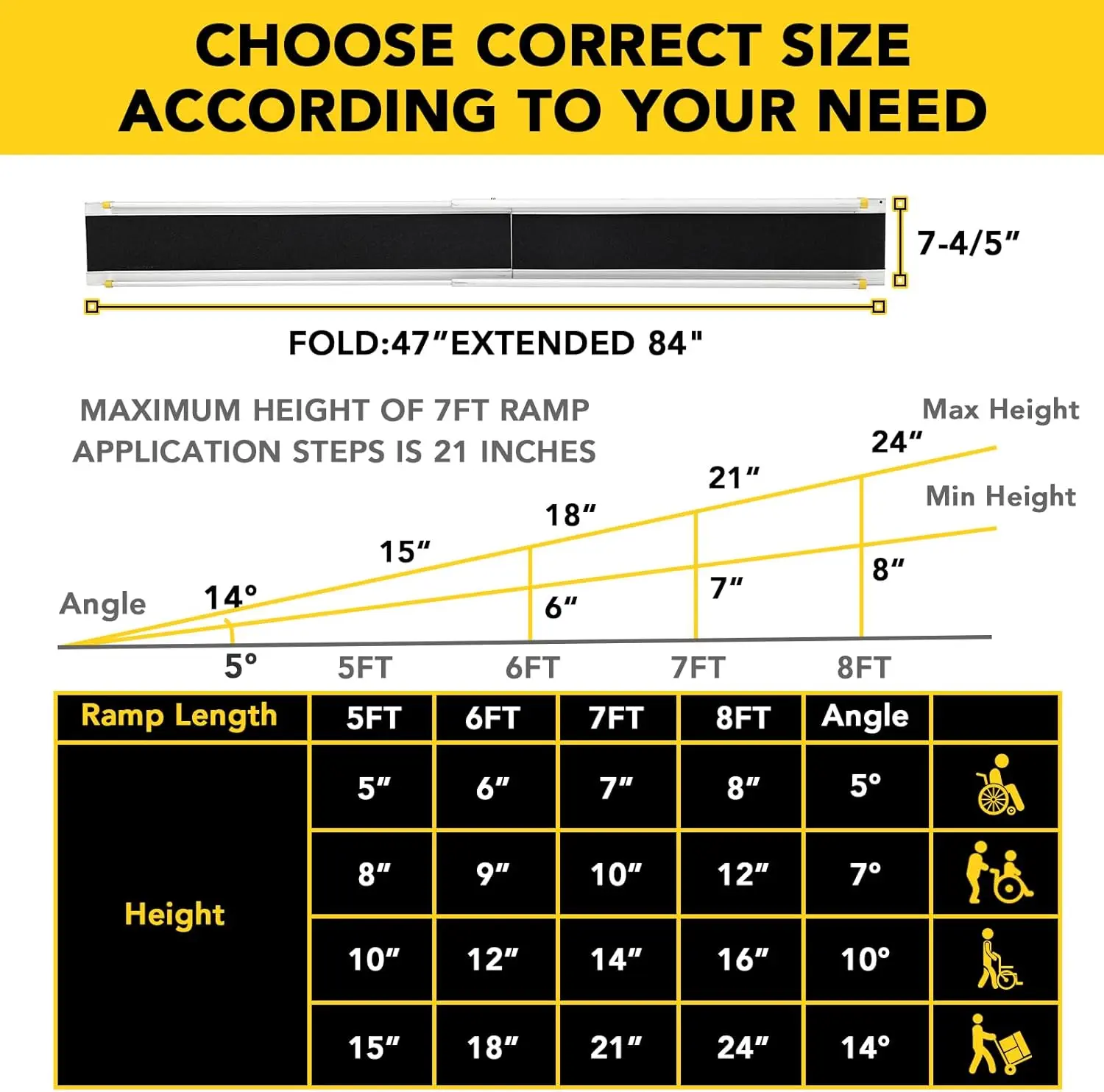 ·ADJUSTABLE WHEELCHAIR RAMP: This ramp is sold in pairs. Both wheelchair ramps are 8' long, ramps can be used for steps from 9.6" - 24" . All locks on the wheelchair ramp are made of stainless steel. The degree of curvature of the locks on the ramp can be adjusted by tools. You can use the locks to make the wheelchair ramp any length you want.