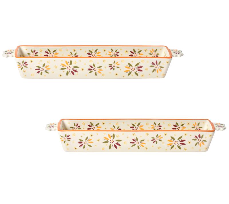 Everything you serve looks even more appetizing with this set of ceramic cracker trays. Whether you're hosting a casual family snack time or a holiday celebration, their easy-to-carry handles make serving crackers, breads, or desserts a delight. From Temp-tations® Ovenware.