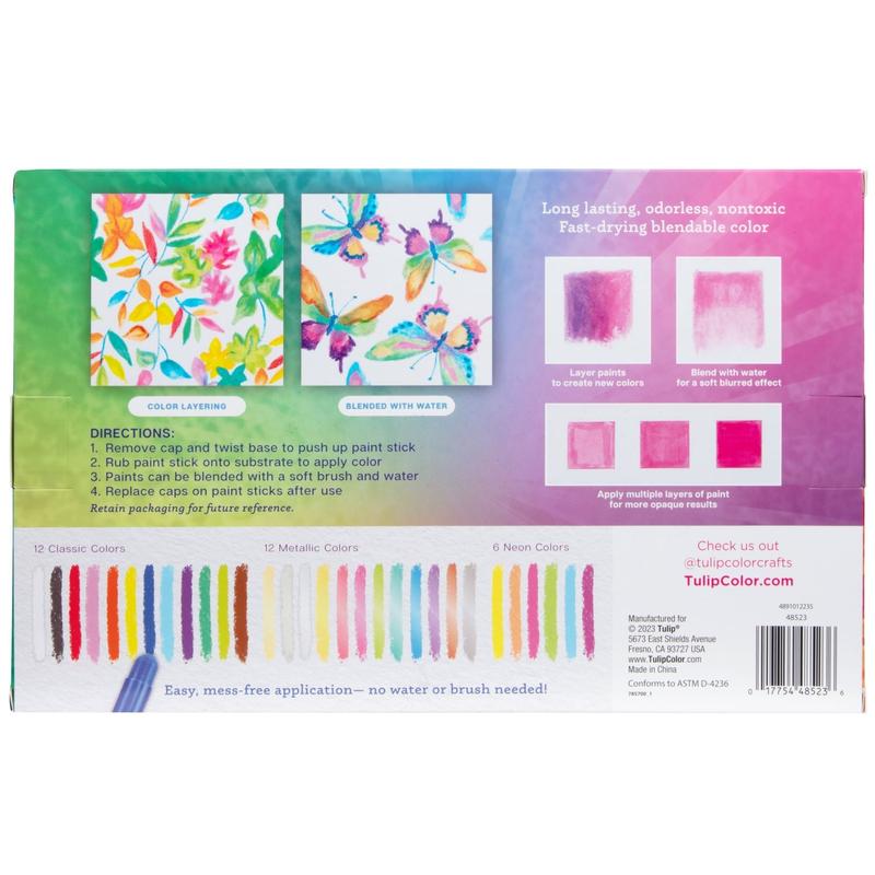 Tulip Tempera Paint Sticks are a mess-free alternative for your painting projects— no water or brush needed! This value pack includes 30 (0.35 oz) Tempera Paint Sticks in a must-have palette of Classic (White, Black, Red, Pink, Orange, Yellow, Green, Light Green, Blue, Light Blue, Purple, Brown), Metallic (Gold, Silver, White, Yellow, Red, Pink, Green, Turquoise, Blue, Brown, Gray), and Neon (Yellow, Orange, Pink, Green, Blue, Purple) colors. These paint sticks are super easy to use; just remove the cap, twist the base, and paint! Great for paper, wood, and cardboard crafts!