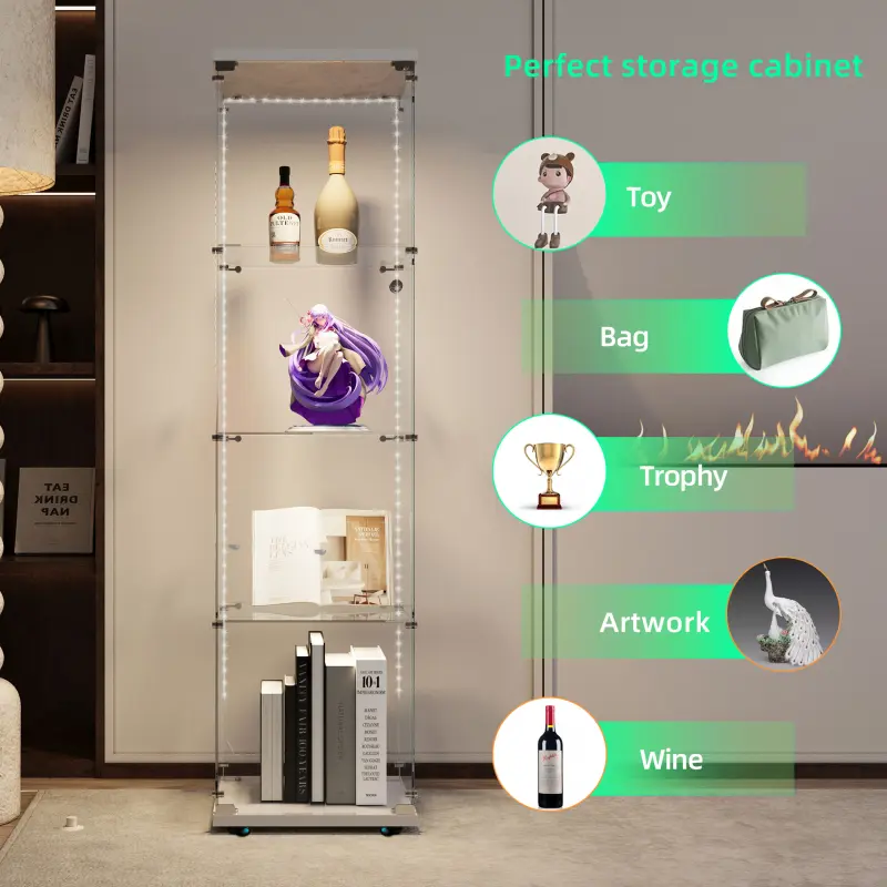 ·This tempered glass cabinet comes with a Bluetooth LED light strip that can be controlled by both a remote control and a mobile app. It can also dance the rhythm of surrounding music and will sense your presence to turn on the lights for you. The design of the light strip adds a mysterious and romantic atmosphere to this cabinet.