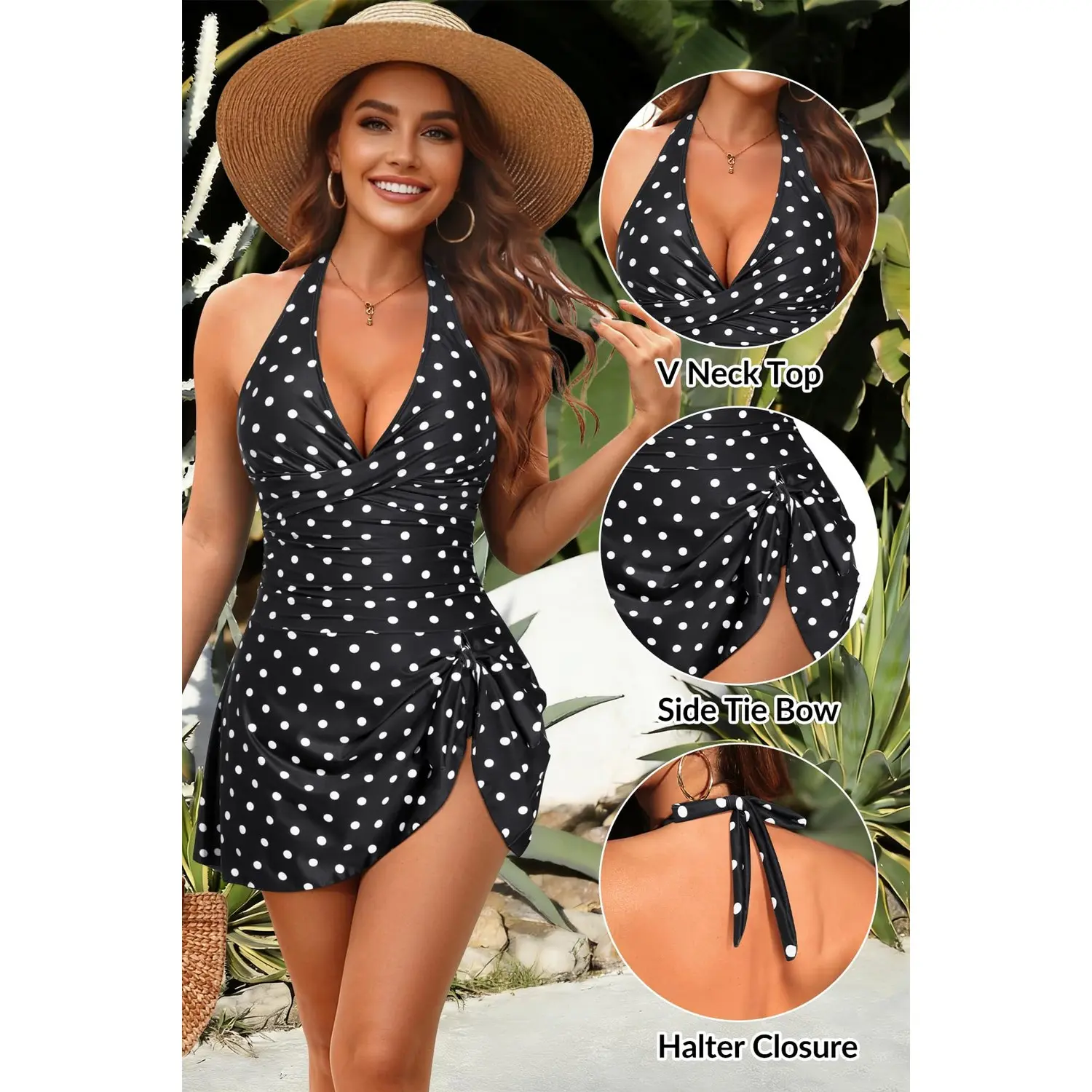 ·Swim dress for women: This one-piece swimdress features a sexy deep V-neck and a classic halter design. It perfectly combines the feminine grace of a dress with the functionality of a professional swimsuit, creating a timeless pin-up look that enhances your natural curves.