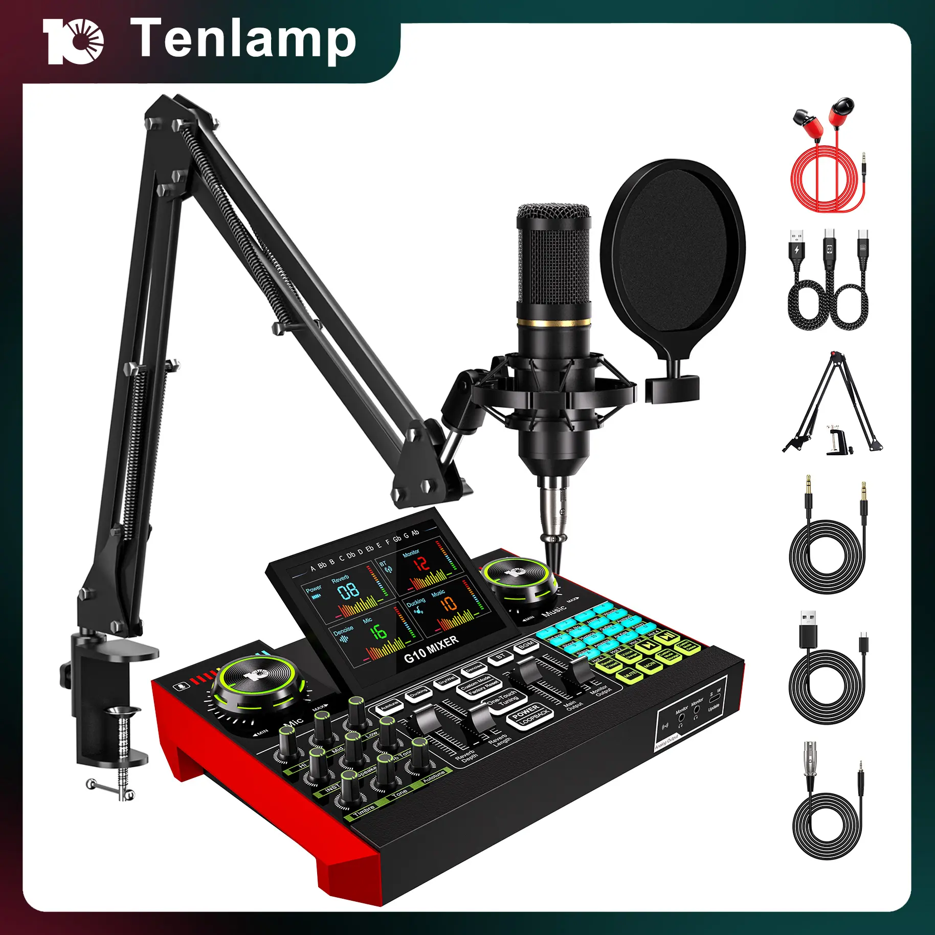 【Podcast Equipment Bundle】The podcast microphone bundle includes everything you need for professional-quality audio creation: a 3.5mm condenser microphone with a disk bracket and the G10 Sound Board. Perfect for podcasters, gamers, streamers, and content creators who want an all-in-one solution for mixing, recording, and streaming.