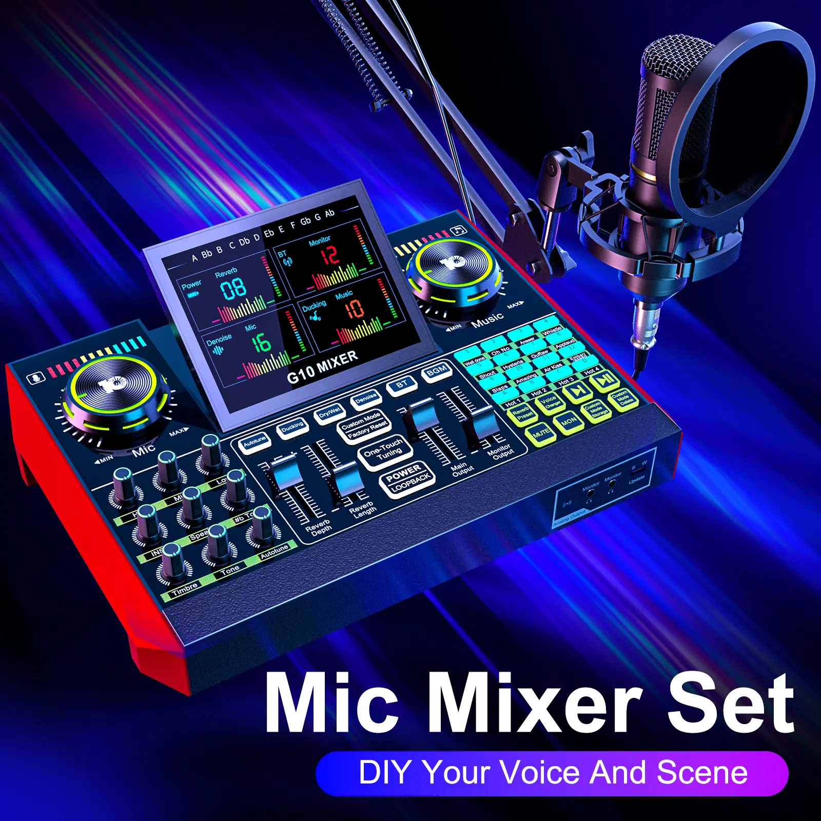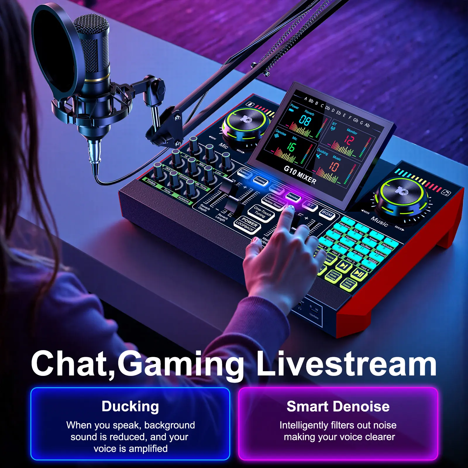 【Voice Changer for Fun & Creative Streams】Switch up your sound with the built-in Voice Changer. Transform your voice into a female, deep, baby, or magical voice—perfect for adding some fun and creativity to your streams or podcasts. Customize the sound with bass and reverb adjustments to make it uniquely yours.