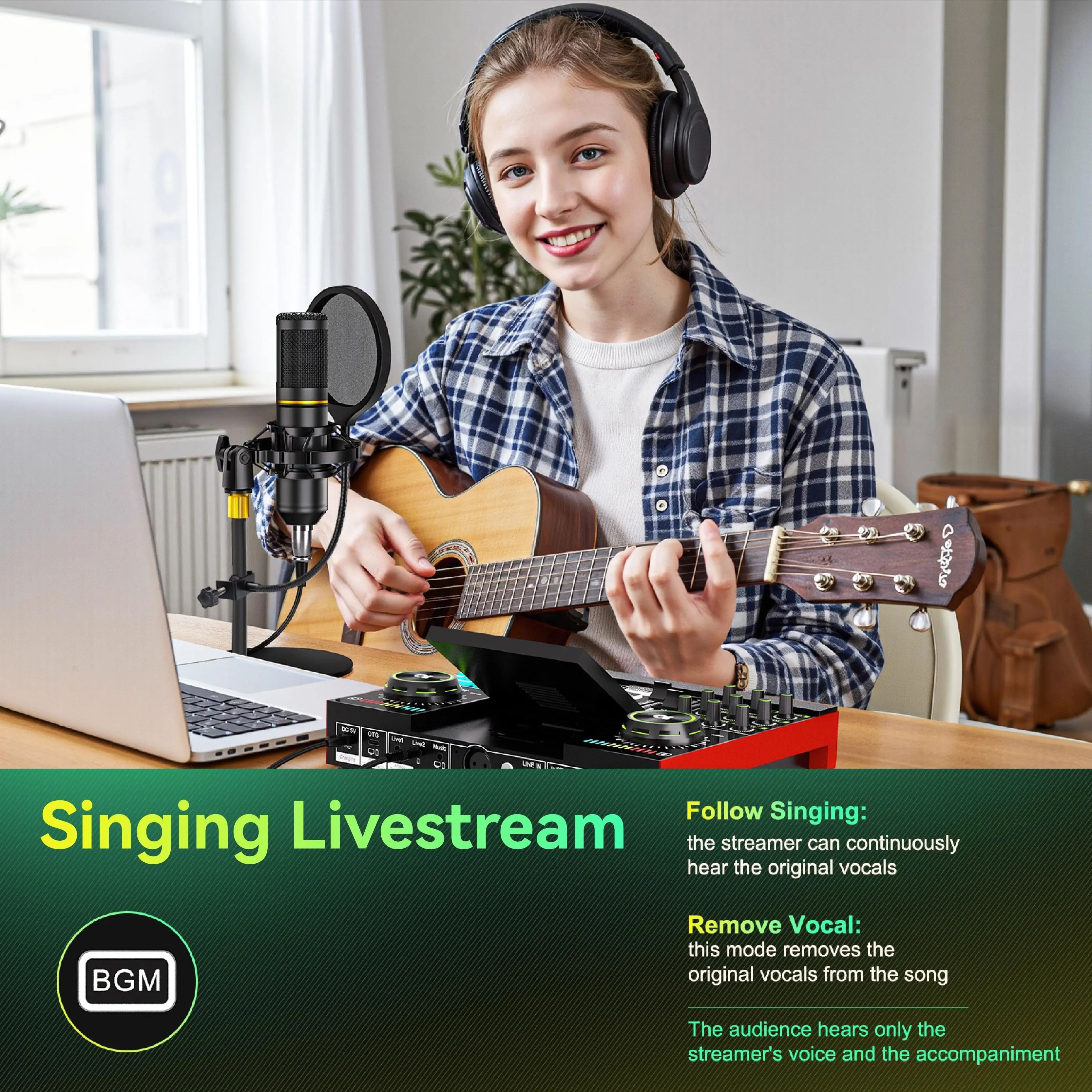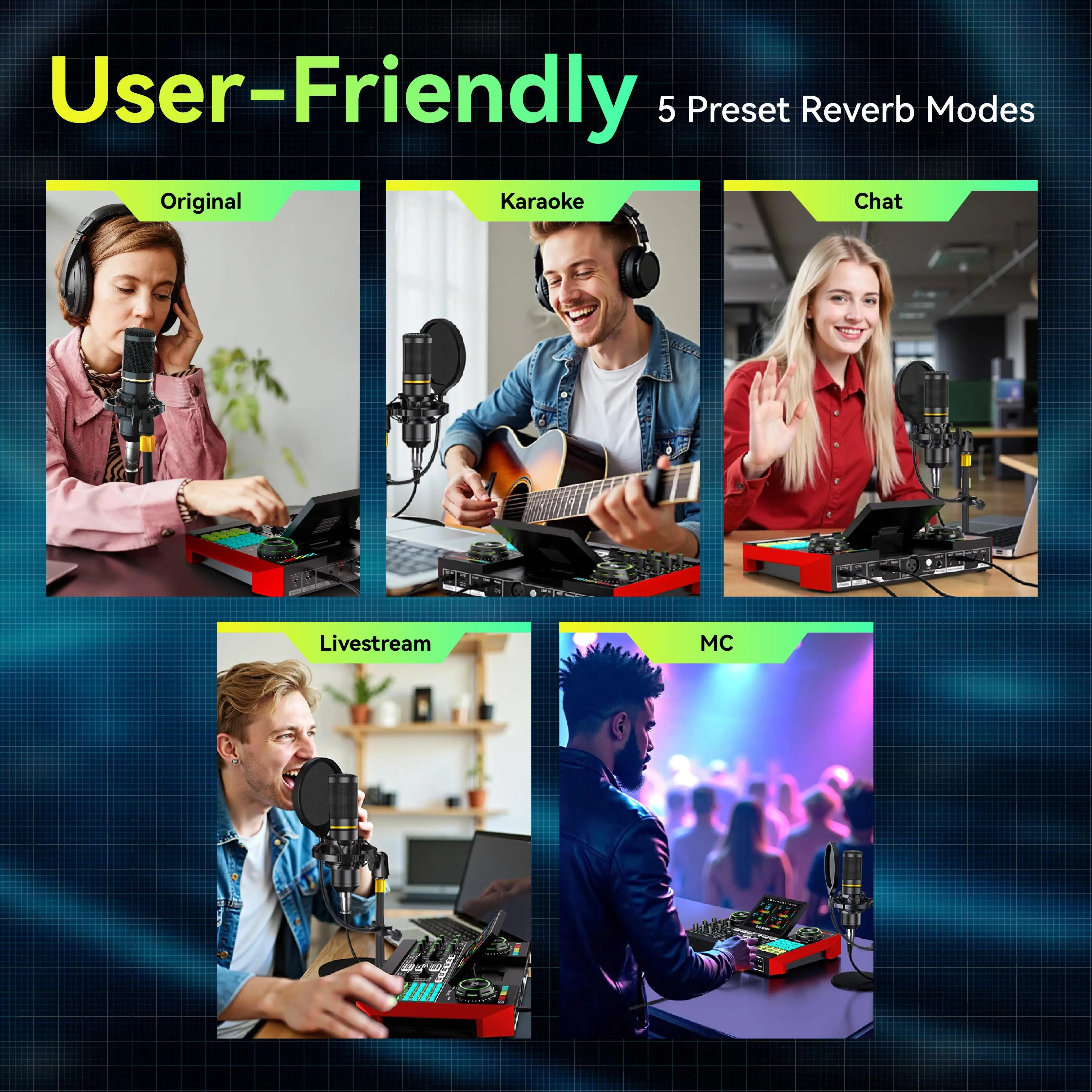 ·Features-rich: Built-in 2 levels noise reduction, Loopback, Auto ducking, One-touch tuning, Mute, Monitor, BT music switching, Dry/wet recording, Remove vocals, 16 interesting sound effects and more. Easy and full to control your live streaming rhythm.