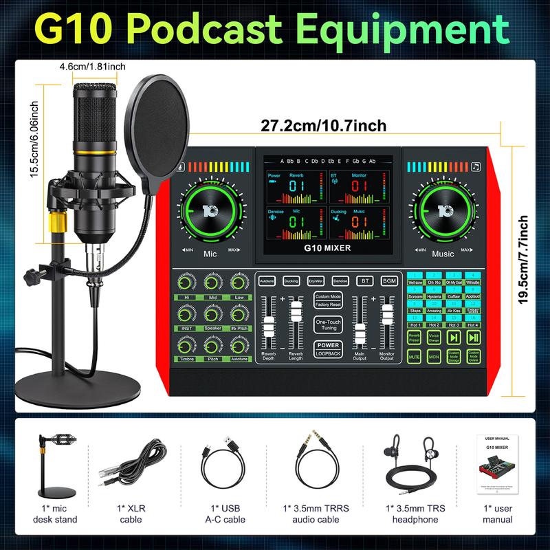·Bring The Studio Home: G10 XLR audio interface build in 3-band EQ, Reverb, Voice Changers, Timbre, Pitch, #b Pitch, Autotune, and more, tune to your voice in real time, make your content creations more professional and entertainment.