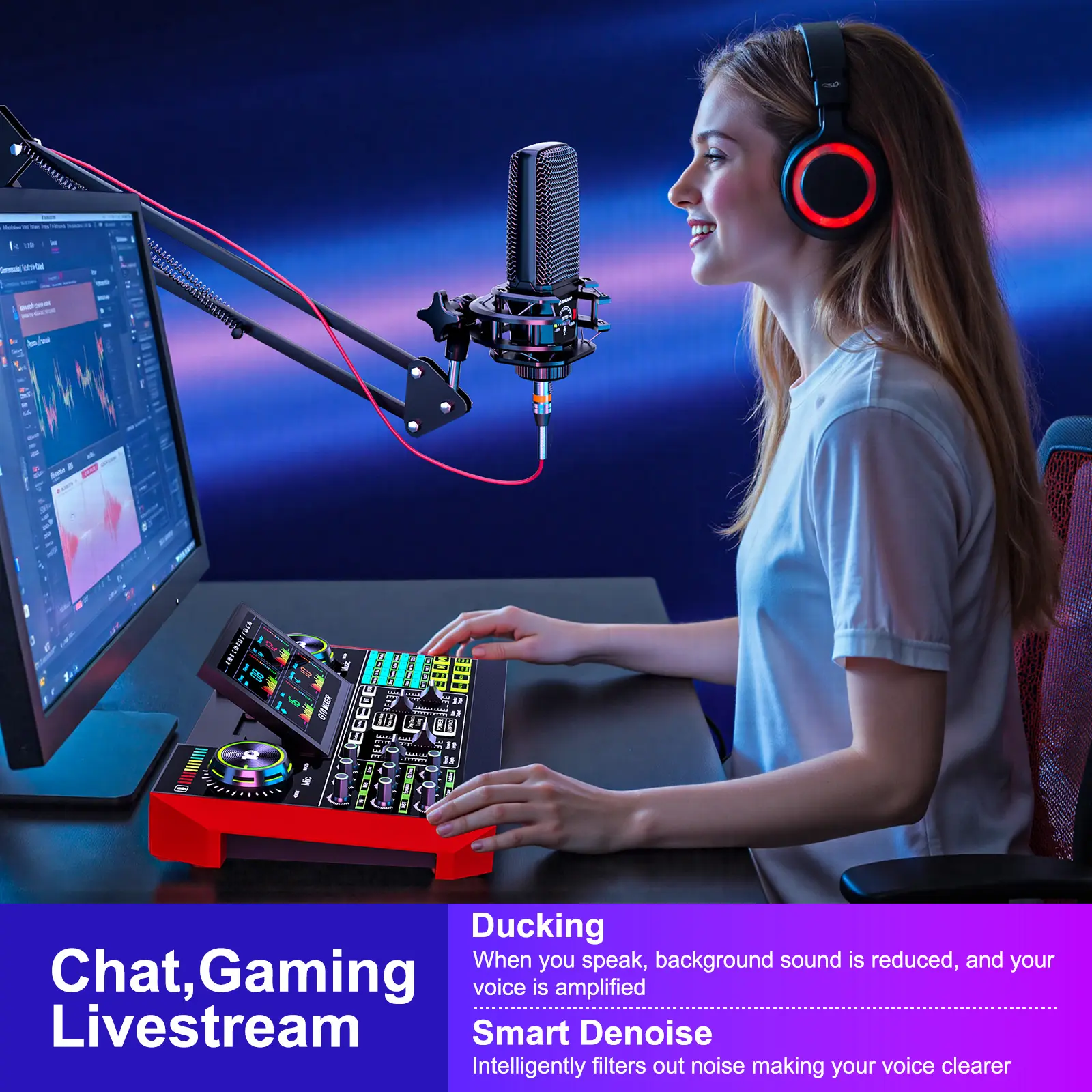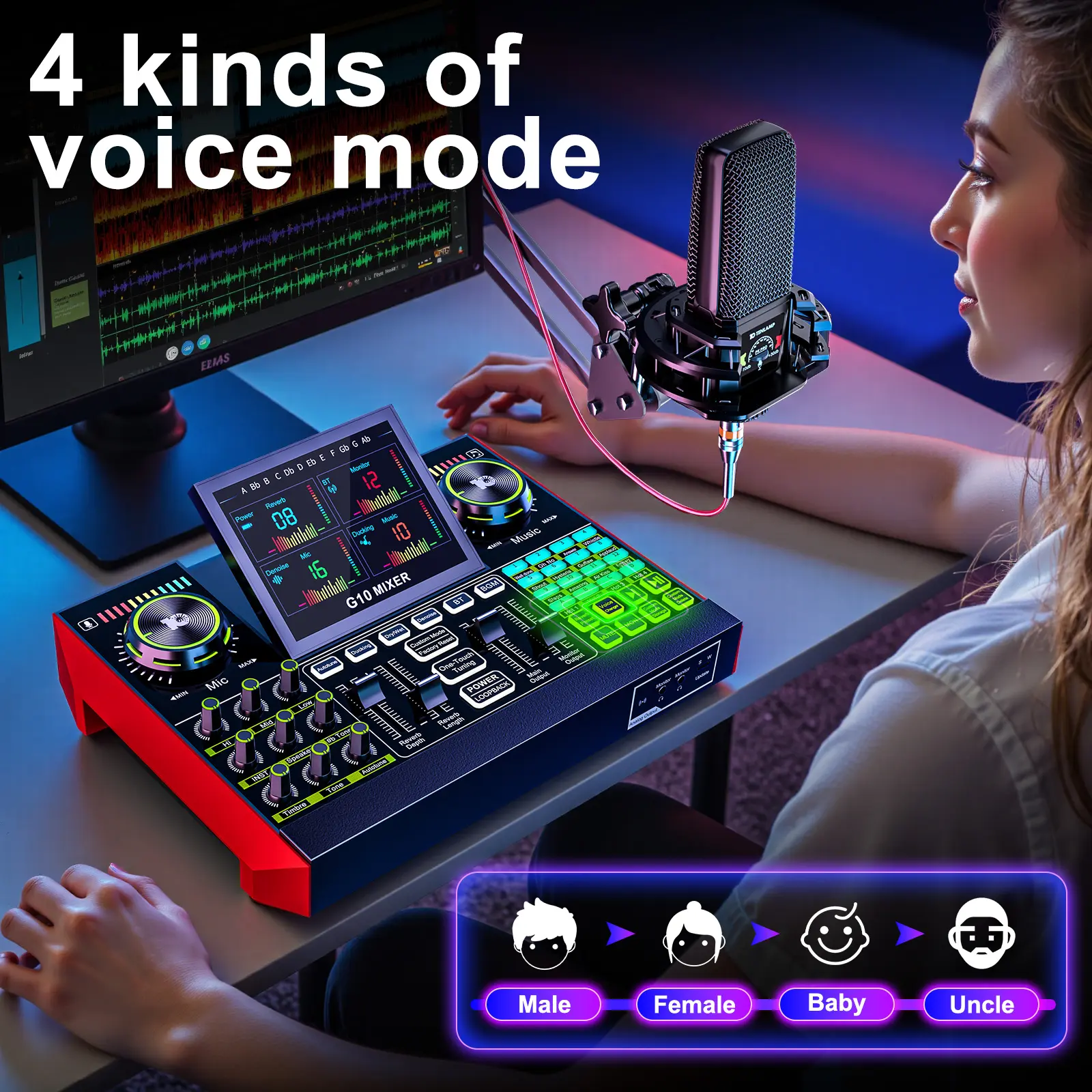 【Voice Changer for Fun & Creative Streams】Switch up your sound with the built-in Voice Changer. Transform your voice into a female, deep, baby, or magical voice—perfect for adding some fun and creativity to your streams or podcasts. Customize the sound with bass and reverb adjustments to make it uniquely yours.